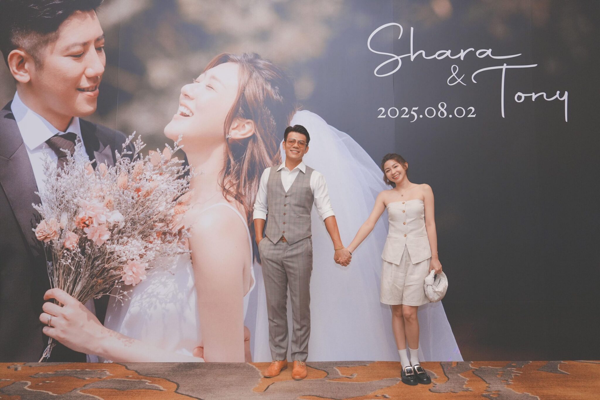 林逸欣與Tony的緣分始於十年前。當時她與合作演出《艋舺耀輝》的李運慶、以及共演《天若有情》的李佳豫收工相約吃飯,猶記得很多朋友不知何故放鳥,最後討論去李運慶家吃飯,結果席間出現李運慶的國中同學、也就是現在的老公Tony。Shara笑說:「沒想到那一頓飯,竟是我們故事的開頭。」Tony展開熱烈追求,兩人因志趣相投而逐漸靠近,最終在2022年完成登記成婚,這場「Shara❤Tony囍宴」,則是三度籌備、終於圓夢的幸福儀式。