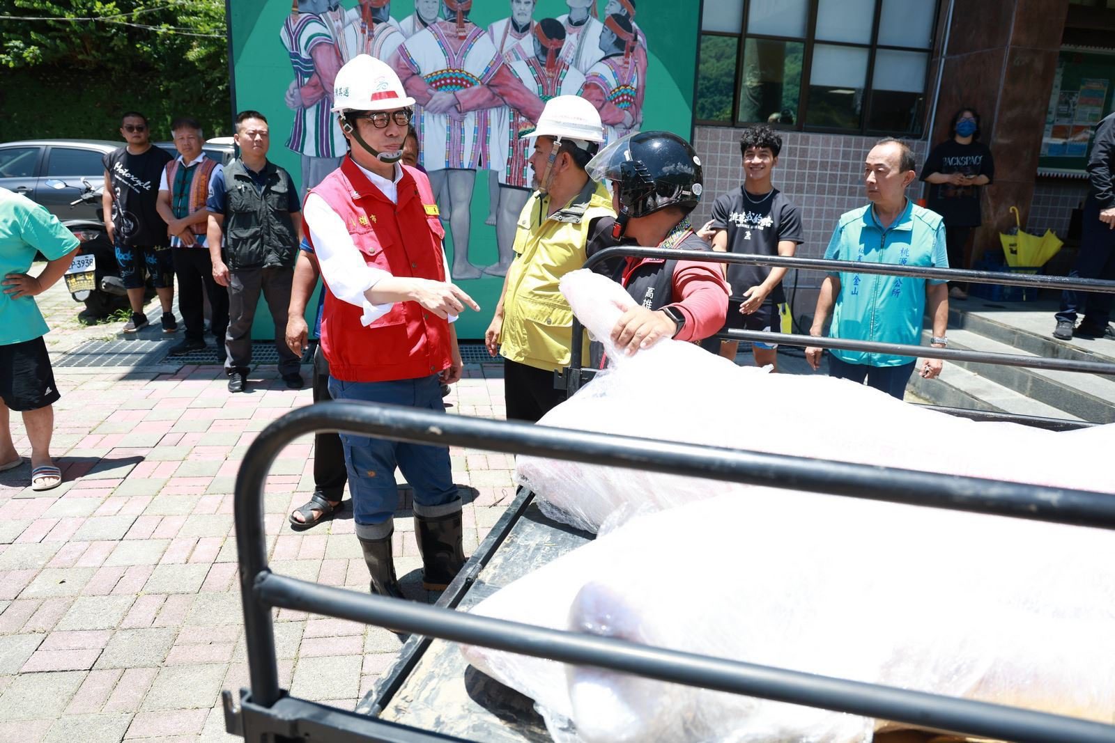 陳其邁今日親赴桃源北三里送整豬 三日配送十四里助重建。(高市府提供)
