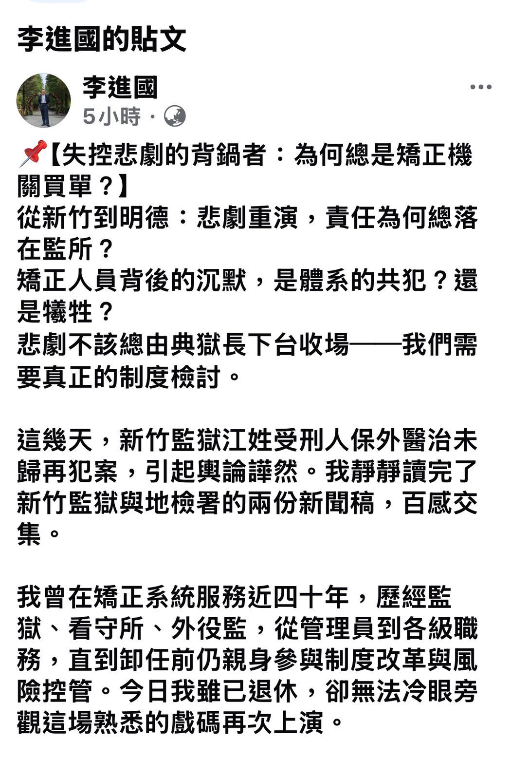 針對近日新竹監獄江姓受刑人保外醫治未歸再犯案,引發社會譁然與輿論撻伐,曾任台南監獄典獄長、2024年退休的資深矯正人員李進國,於8月6日在其個人臉書發表千字長文,直言:「悲劇不該總由典獄長下台收場!」疾呼制度共責、司法體系須建立「跨部門聯防機制」,矯正機關不該一再成為代罪羔羊。