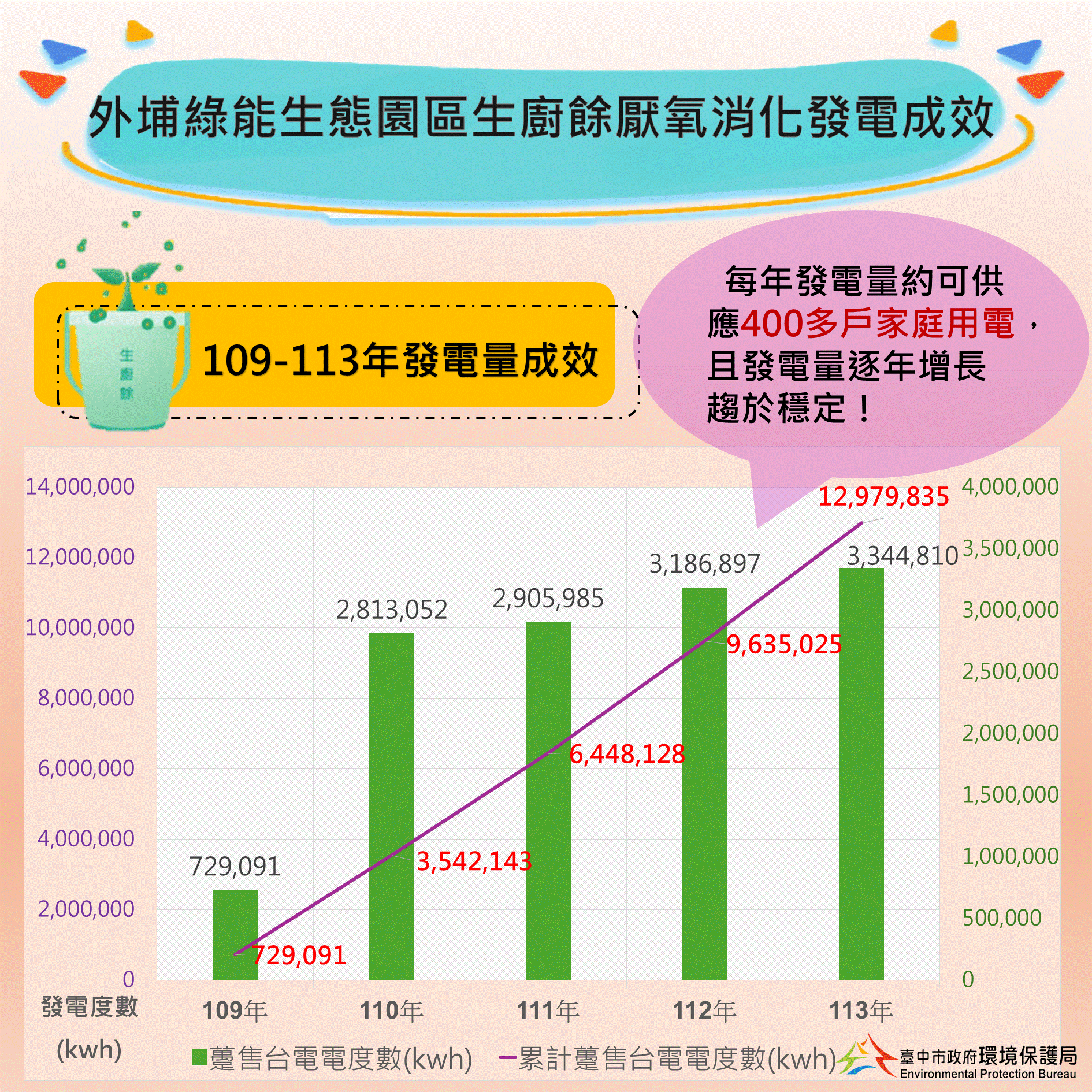 環保局說明,台中市外埔綠能生態園區發電量,從109年72萬9,091度提升至113年334萬4,810度,以4口之家每月使用電量700度估算,約可供應400戶家庭用電,發電量逐年增長且趨於穩定,至113年底累積發電量已達1,297萬9,835度,展現了廚餘資源化與生質能源創造的雙重效益,為永續發展樹立典範。