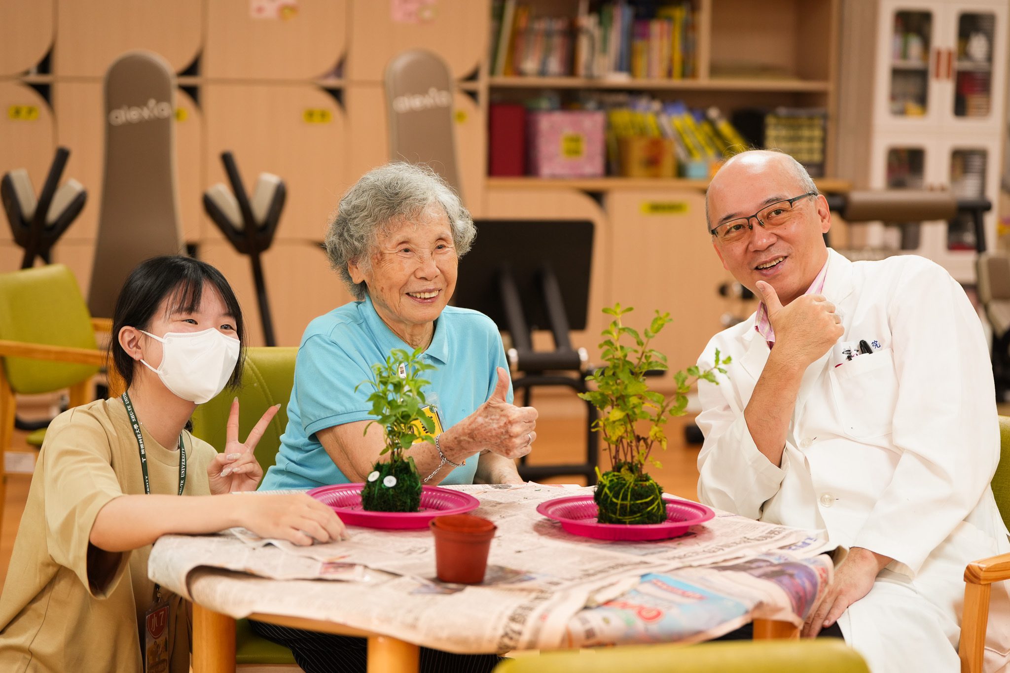 當「青春」遇上「長青」,會擦出什麼火花?聖功醫院失智日間照顧中心化身為療癒系教室,樹德科技大學行銷管理系李瑩怡老師,昨天(5日)上午帶領15位學生走進本院失智日照中心,和30位長輩一起手作水苔球,長輩與年輕學子一起用雙手包裹水苔、用棉線細細纏繞,製作成一顆顆圓滾滾,綠意盎然的「水苔球」,這是長輩的手指活動,更是一場跨世代的溫暖交流。