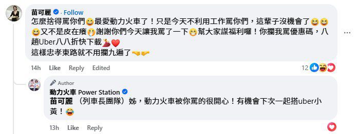 Uber 前後任代言人動力火車和苗可麗社群延續「鬧劇」,苗可麗暖回動力火車「怎麼捨得罵,但不利用工作罵,這輩子沒機會了!」,動力火車小編也答應「下次一起叫優步小黃!」社群上有許多粉絲興奮分享:「來看煙火居然能看到現場版的八點檔!」,網友還許願動力火車「想看老爺演八點檔長壽劇!」,陳冠霖也回「請搭優步小黃來客串八點檔喔!」