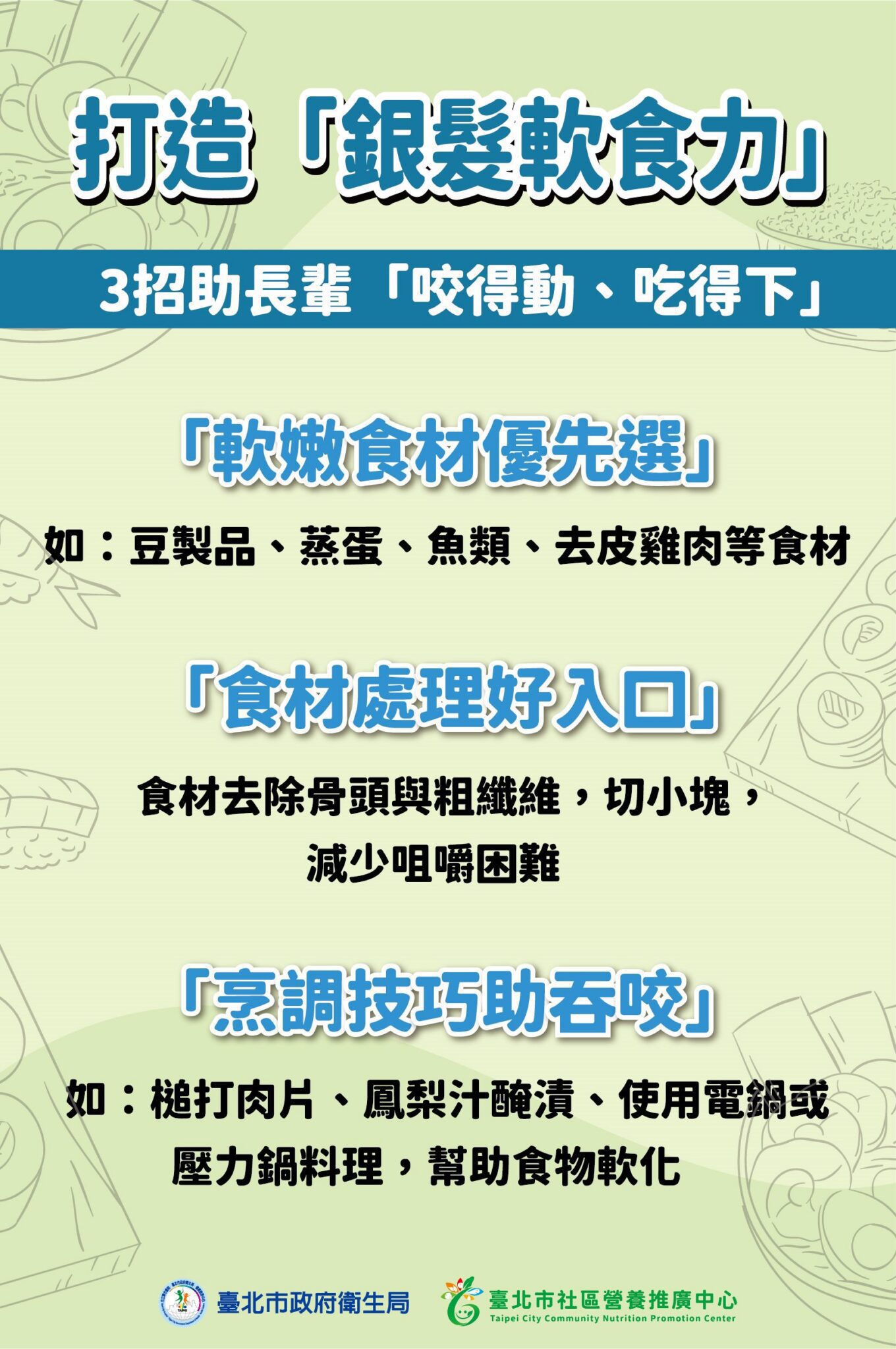 臺北市社區營養推廣中心魏子秦營養師呼籲,營養是生命的基石,每天的均衡飲食攝取是健康老化的關鍵;除均衡攝取6大類食物外,透過食材挑選或是改變烹煮技巧,並運用「3招銀養軟食力」製備長者容易入口的餐點,並使用叉子、湯匙確認調整食物質地,達到天天吃得下,營養跟著來