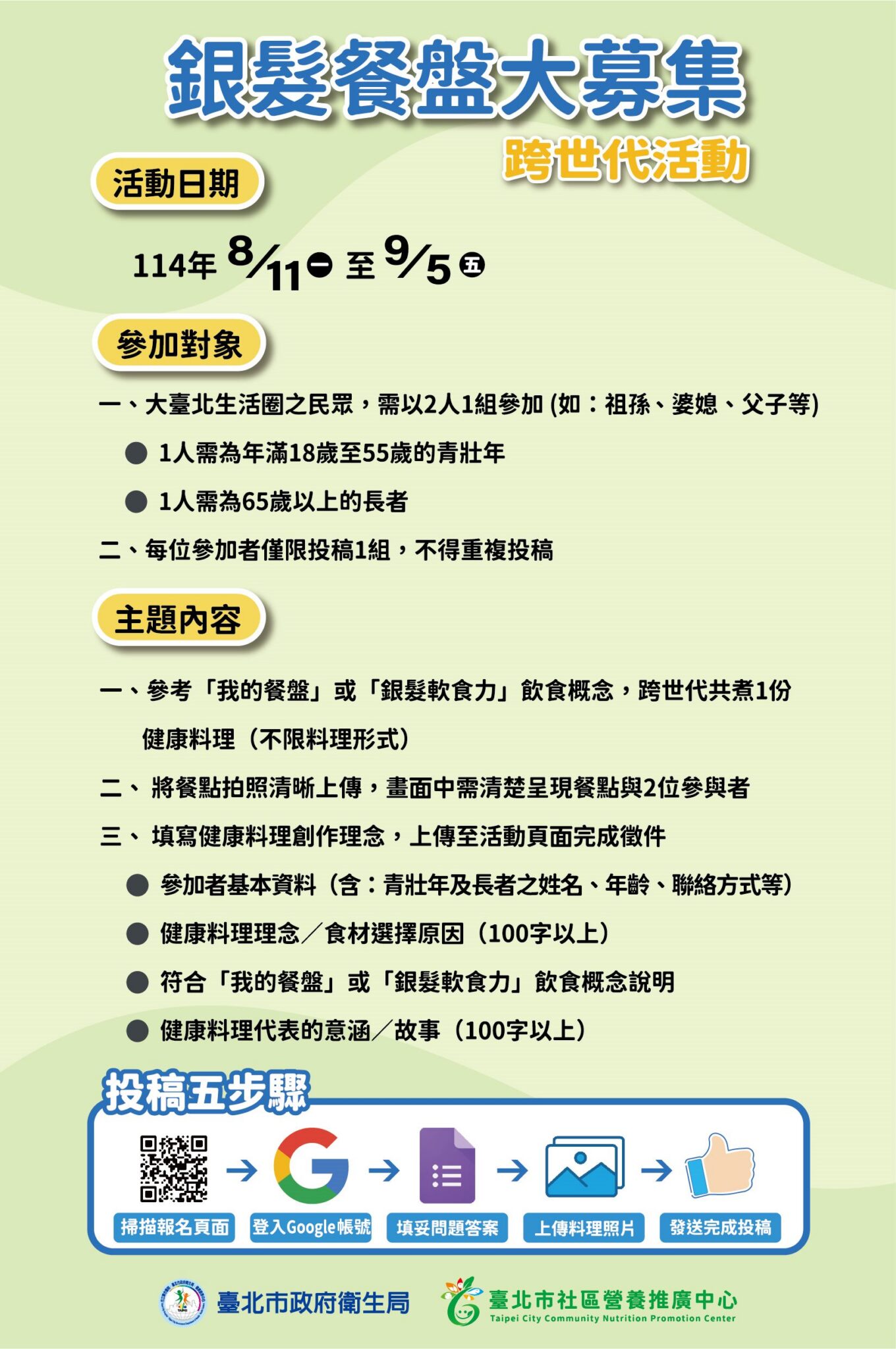 臺北市衛生局表示,為讓青壯年朋友重視家中長者高齡營養,於8月24日祖父母節前夕舉辦「銀養餐盤大募集」活動。由青壯年與長輩共同設計飲食,還有機會獲得最多400元加菜金!