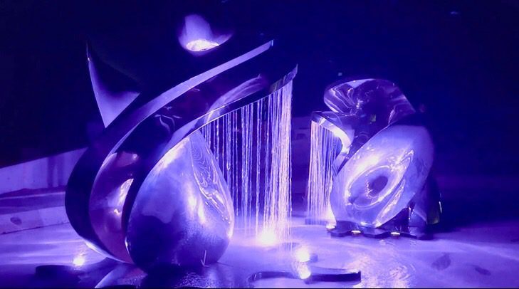 台中市政府觀旅局長陳美秀表示,藉由公共空間設置藝術作品,拉近與民眾的距離,提升民眾對公共藝術的參與及周邊環境美感體驗,並以「海洋」、「水」及「浪花」等3要素勾勒與海洋館相呼應的公共藝術作品;其中一座作品「悠游水漾」的設計理念是以水及海洋為出發,透過鏡面不鏽鋼反射魚群在水池中悠游的樣貌,內部設置引水裝置讓水流由上而下的形成一幕水簾,水流動的同時,彷彿看到魚群在無邊無際的海洋中暢游。