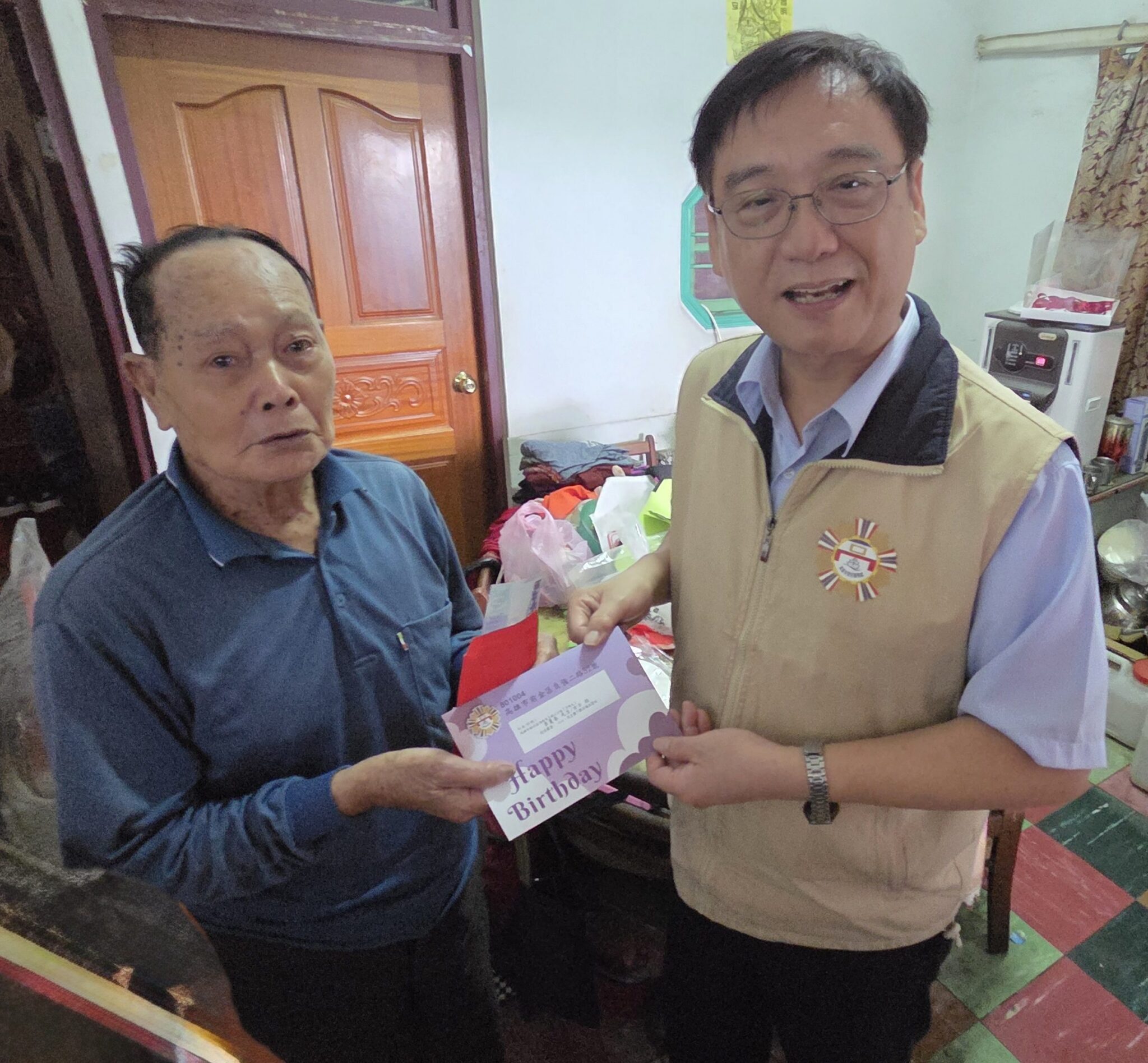 爺爺年紀雖長但精神矍鑠、外表神采奕奕,對來訪人員親切寒暄,熱情分享過往軍旅生活點滴,展現堅毅性格與豐富人生歷練。劉處長除親自獻上祝賀外,也對前輩將黃金歲月都貢獻給國家,無私付出行為表達崇高敬意,並感謝家屬長年悉心照顧,讓長輩安享天年。