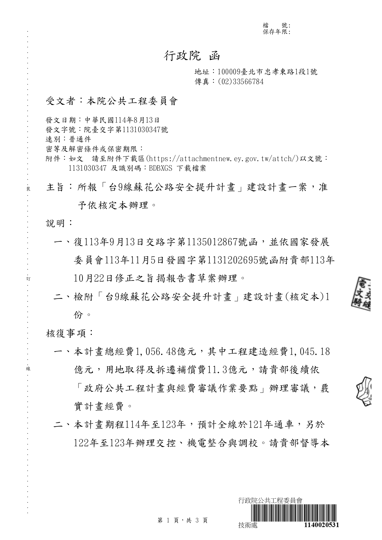 依照行政院最終核定,蘇花安計畫總經費1,056.48億元,其中工程建造經費1,045.18 億元,用地取得及拆遷補償費11.3億元。計畫期程114年至123年,預計全線於121年通車,另於 122年至123年辦理交控、機電整合與調校。