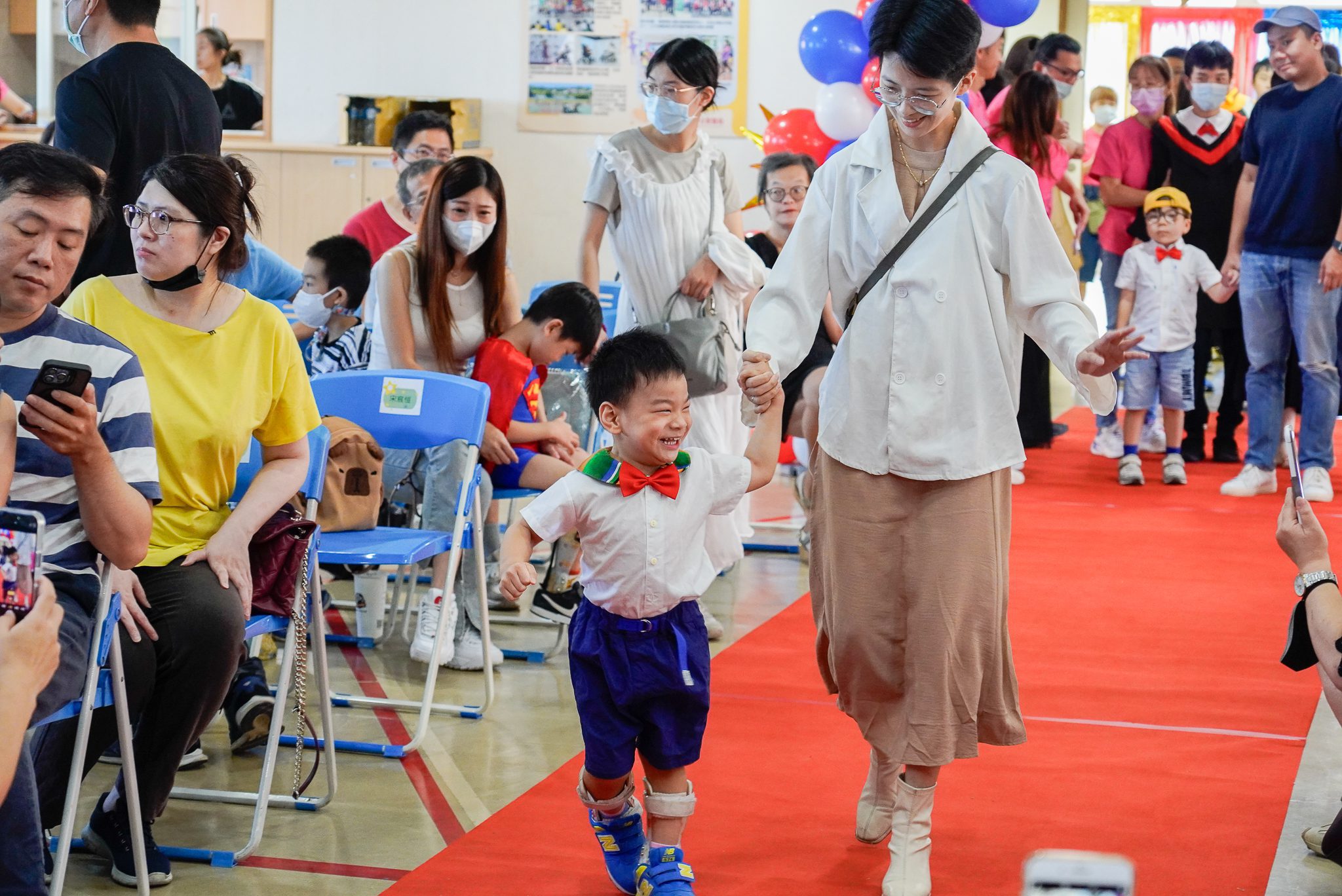 三峽日托中心畢業生熙熙身子嬌小,她即將就讀桃子腳國小特教班。熙熙出生時插著鼻胃管,有視力和聽力等多重障礙,二歲多進入日托中心就讀。在老師們耐心引導與訓練下,從不會走路到現在獨力行走,進場時自信地走紅毯,讓爸媽都紅了眼眶。