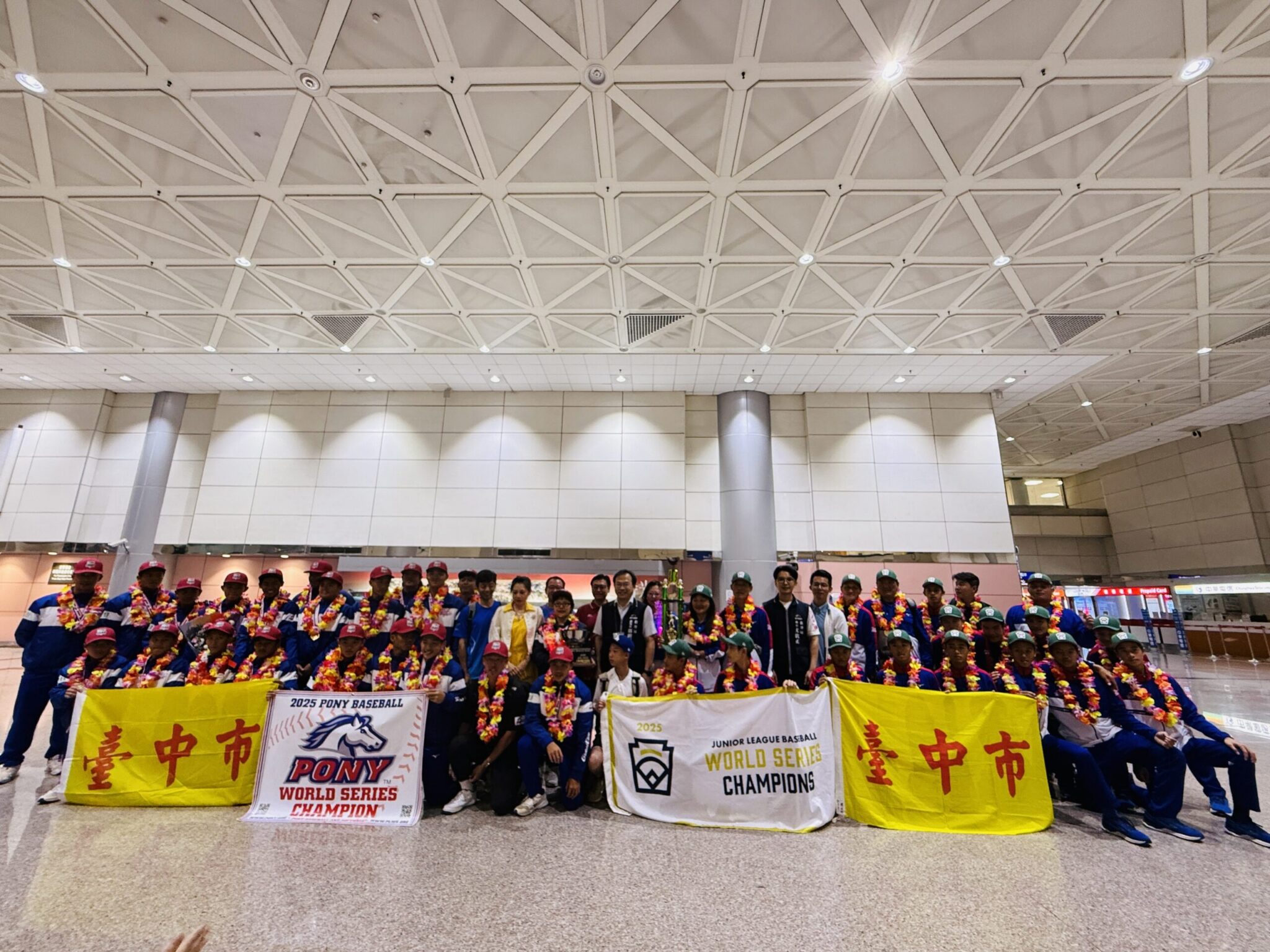 台中市青少棒小將勇奪雙料世界冠軍!中山國中棒球隊代表出征「2025 世界少棒聯盟(LLB)世界次青少棒錦標賽」;而由中山、向上、西苑及豐陽國中組成的中市青少棒代表隊接續代表參加「2025 PONY小馬級世界青少棒錦標賽」,兩項賽事雙雙於美國賽場發揮頂尖實力,摘下世界冠軍金盃,創下台中市同年囊括LLB次青少棒與PONY青少棒世界賽冠軍的歷史紀錄。市府教育局副局長郭明洲今(17)日代表市長盧秀燕率領中山國中、向上國中及豐陽國中校長、教師及家長們前往桃園機場接機,為國爭光的城市小將及教練團喝采。