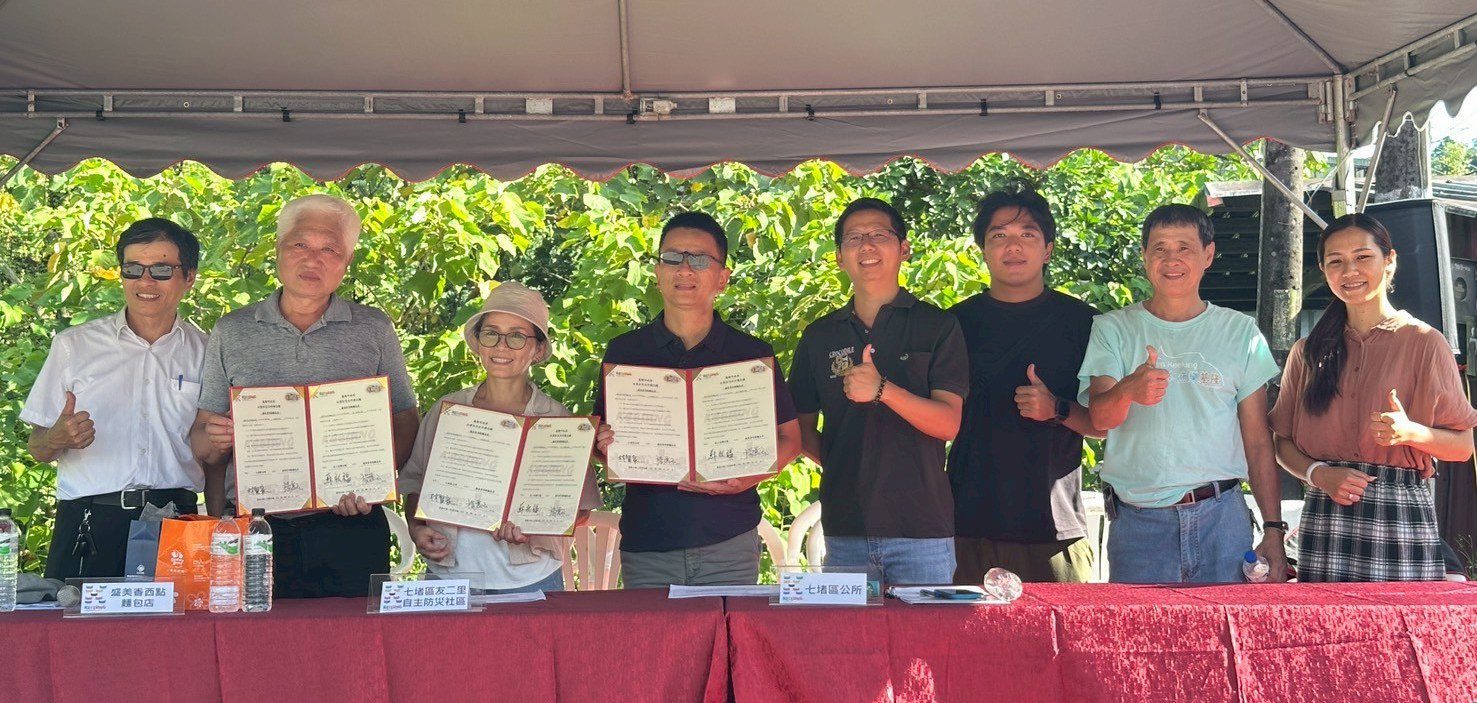 活動中同步舉行「防災企業簽訂儀式」,由七堵區公所與盛美香西點麵包店攜手合作,成為在地防災的重要夥伴。麵包店負責人楊麗玉笑稱:「如果道路中斷,就一起來盛美香啃吐司吧!」為嚴肅的防災工作增添一抹溫暖與幽默。