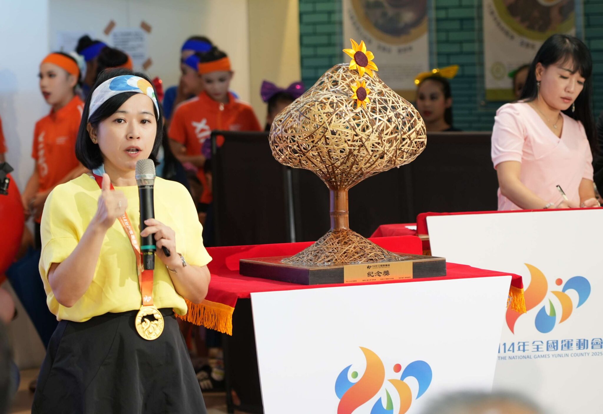 張麗善表示,全運會獎座由雲林竹藝師劉曜誠、纏花工藝師林佩瑩、黏土藝術創作者許永慶聯合創作。劉曜誠選用雲林特產孟宗竹打造穩重基座,象徵「立足大地、展望未來」;林佩瑩演繹春仔花的柔韌與繁盛;許永慶製作祥龍與布袋戲偶,展現運動價值與文化情感的融合,傳達對土地、文化與生命力的致敬。