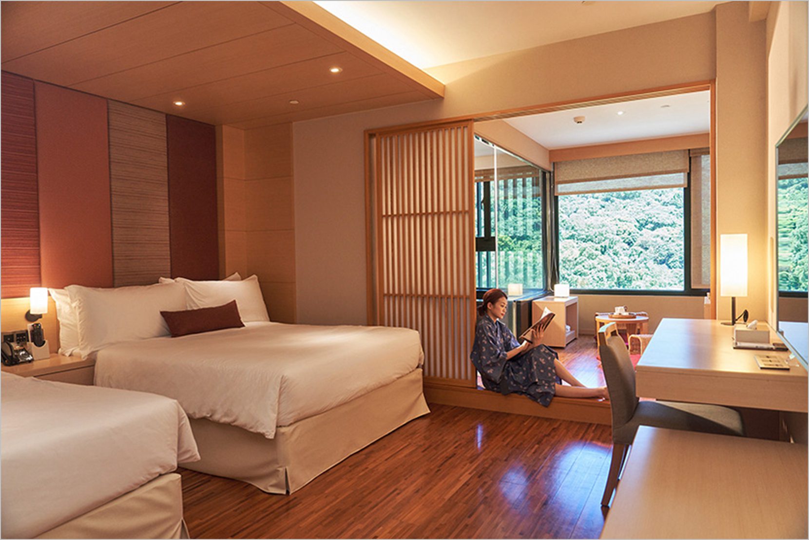 北投亞太飯店坐落於群山環繞之間,客房設計融合現代簡約與和風元素,部分房型設有榻榻米空間,營造舒適靜謐的住宿氛圍,並可遠眺北投山景。每間客房皆配置獨立溫泉浴池,源自北投特有的白磺泉,水質呈乳白色,含有豐富礦物質,具備舒緩肌肉與促進循環的功效,被譽為「美人湯」。在微涼秋日裡,旅客能於客房內獨享專屬湯泉,洗去一身疲憊,盡情沉浸於自然療癒之中。