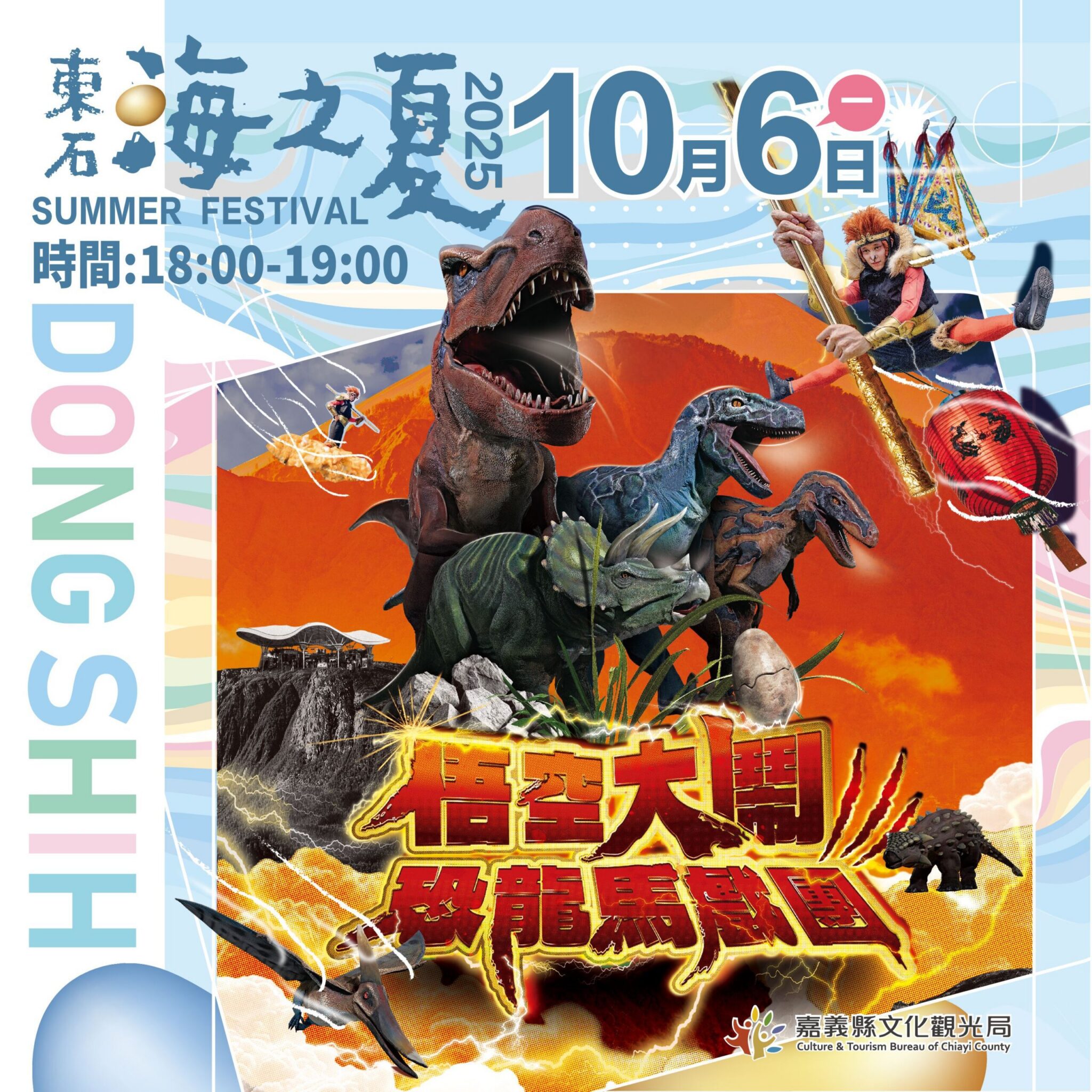 嘉義縣年度盛事「東石海之夏」將在10月4、5、6日的中秋節連假盛大回歸,本土天團玖壹壹、人氣男神鼓鼓,以及金曲製造機蕭秉治等人將輪番帶來演出;10月6日藝響臺灣文化劇團將帶來「悟空大鬧恐龍馬戲團」精彩戲碼,同日晚間7點施放12分鐘的「海上煙火秀」,活動精采可期。