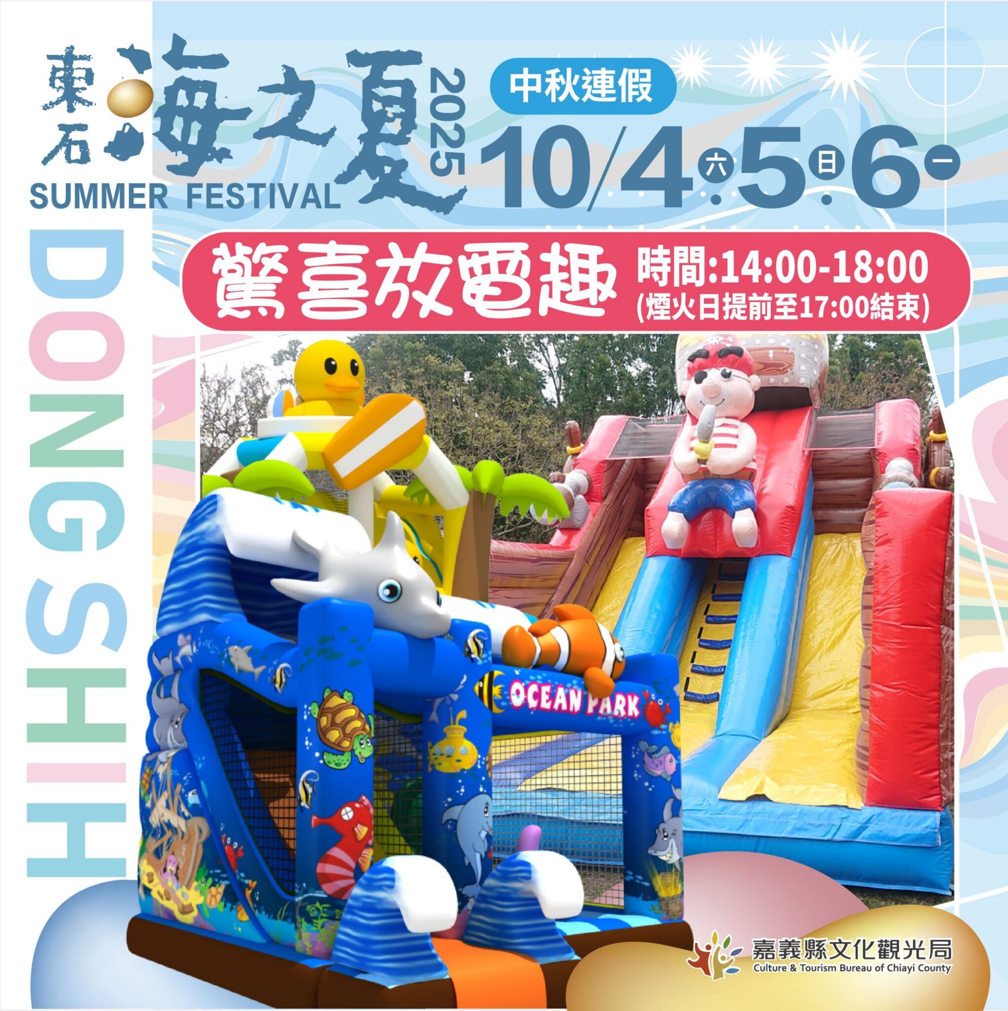嘉義縣文化觀光局提醒家長,帶著孩童參與「東石海之夏」時,務必多帶衣物,現場有豐富消暑戲水設施,今年加入夢想熱氣球及冰雪海盜船機械遊具,也有小朋友最愛的氣墊設施,還安排小芙尼家族與馬戲之門系列演出,讓大小朋友享受豐富多元樂趣。