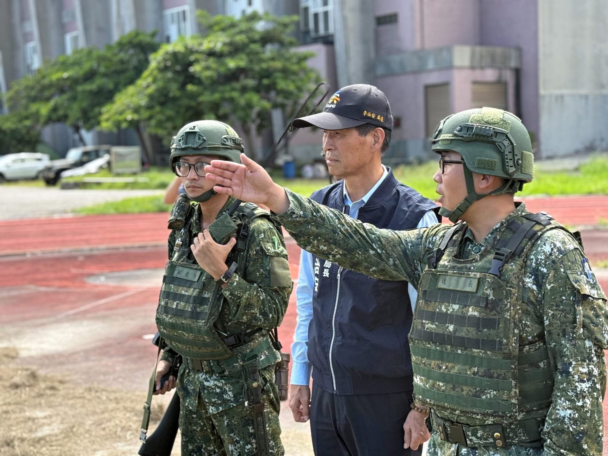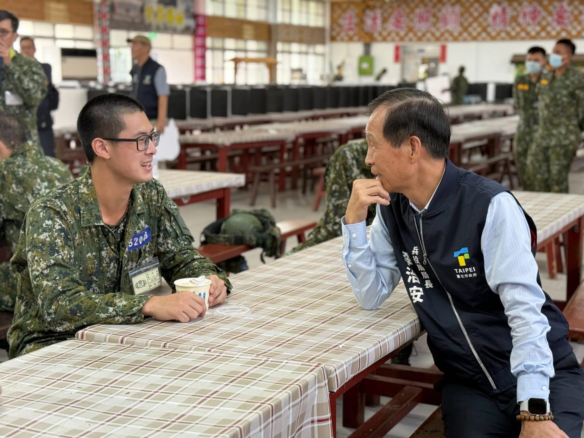 臺北市政府兵役局李治安局長日前,代表蔣萬安市長前往花蓮北埔營區及東華大學美崙校區,關懷陸軍常備兵役軍事訓練第235梯次的役男及慰勞參加教育召集的後備軍人,同時致贈花防部步兵營及花蓮縣後備旅等單位慰問金,感謝部隊幹部對北市籍役男及召員的照顧與訓練。