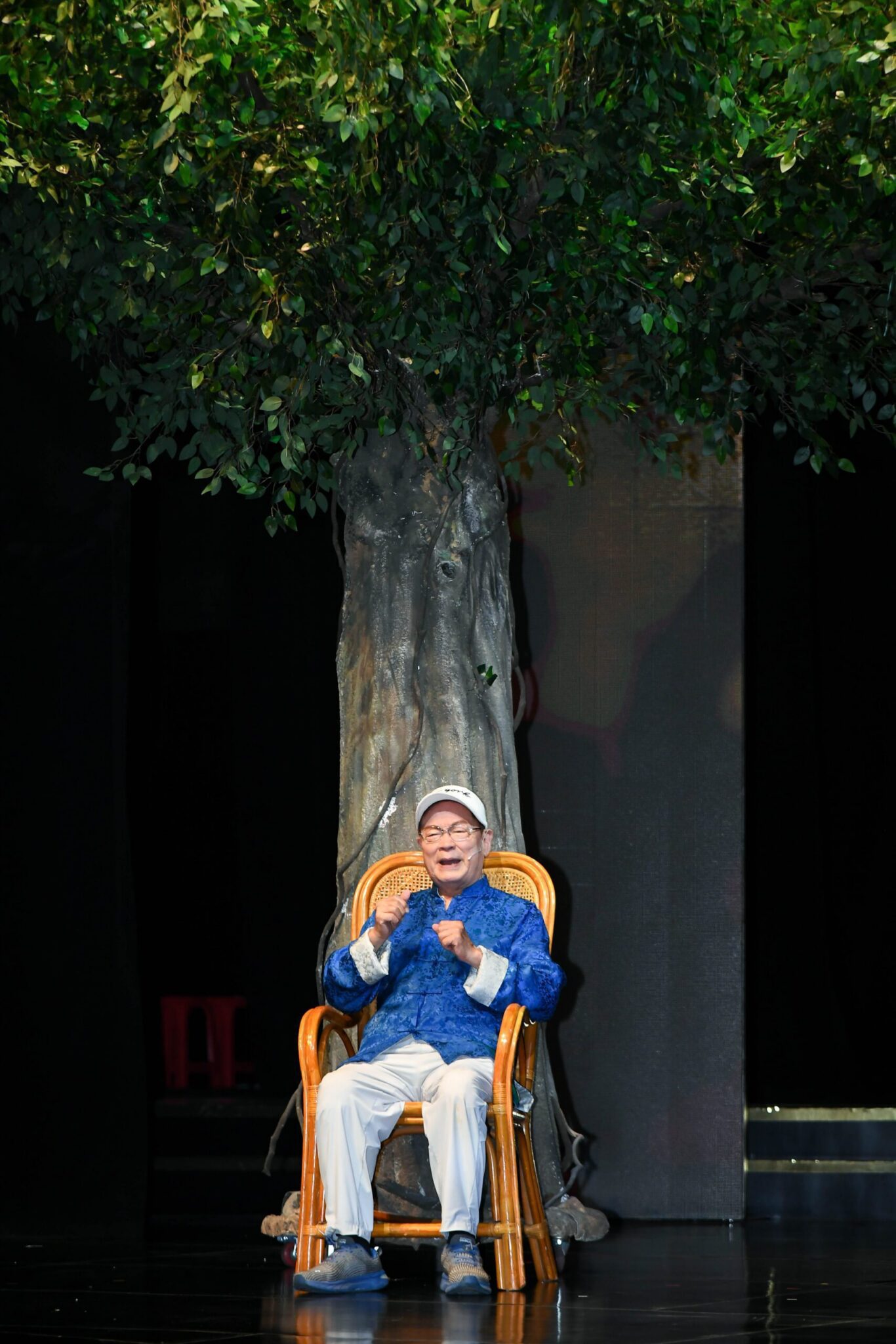 彩排一開始,〈大樹下〉率先登場,融合臺灣民謠、魔術、特技與京劇等多重元素,打造視覺與聽覺並重的文化盛宴。劉福助以「講古阿公」的形象緩緩走上舞臺,帶著觀眾穿越時光,重溫臺灣的情感與故事。他用大家熟悉的「勸世歌」開場,歌聲渾厚溫暖,緊接著穿插各種臺灣俗語與生活趣談,語句間蘊含智慧與幽默。