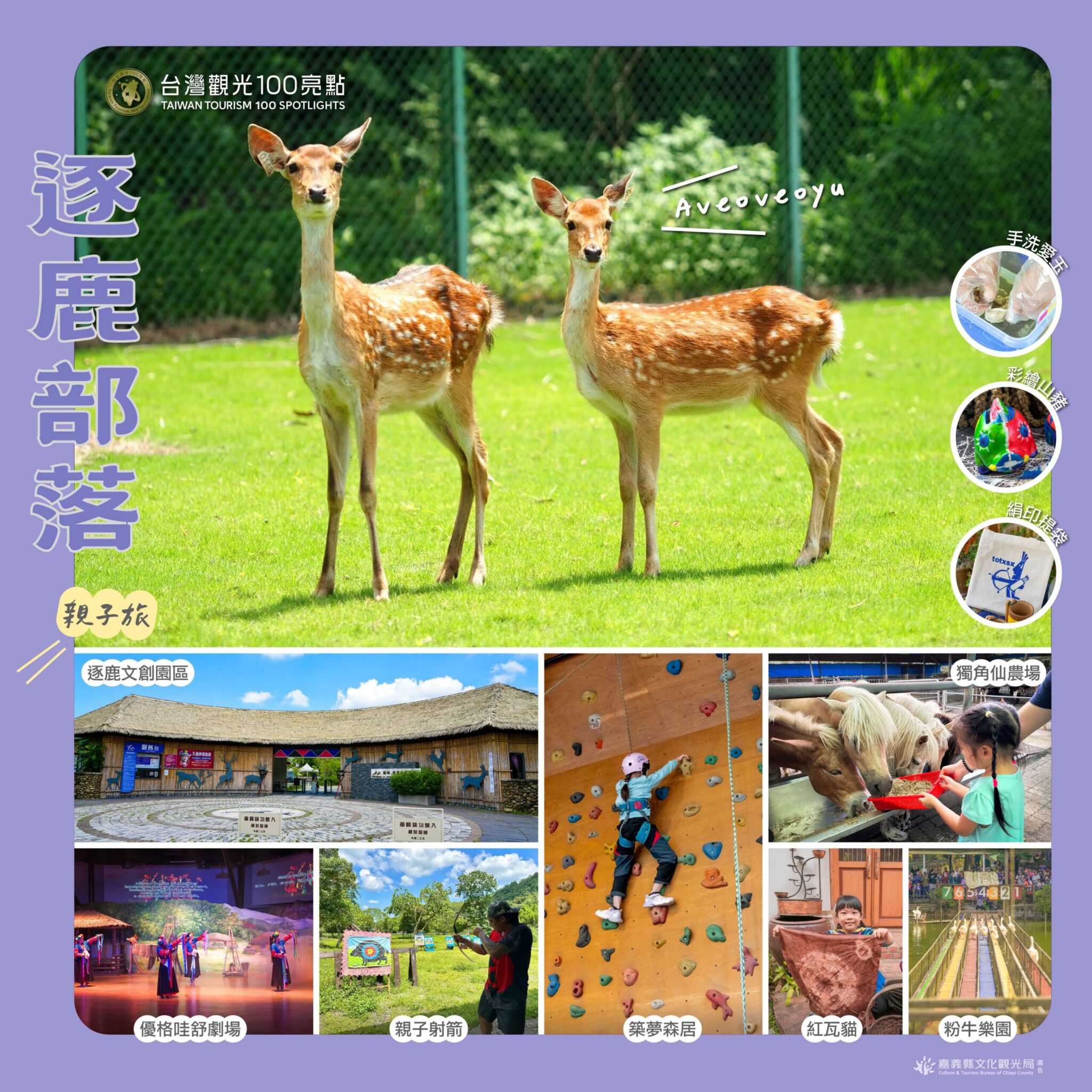 山腳下的「逐鹿文創園區」,不只能看燈光和音效震撼人心的傳統歌舞表演,與可愛梅花鹿互動,還能體驗親子射箭、彩繪山豬、手洗愛玉、絹印提袋。中埔一帶還有「築夢森居」、「獨角仙農場」、「粉牛樂園」、「紅瓦貓」安排玩上一整天超充實。(圖/嘉義縣府提供)