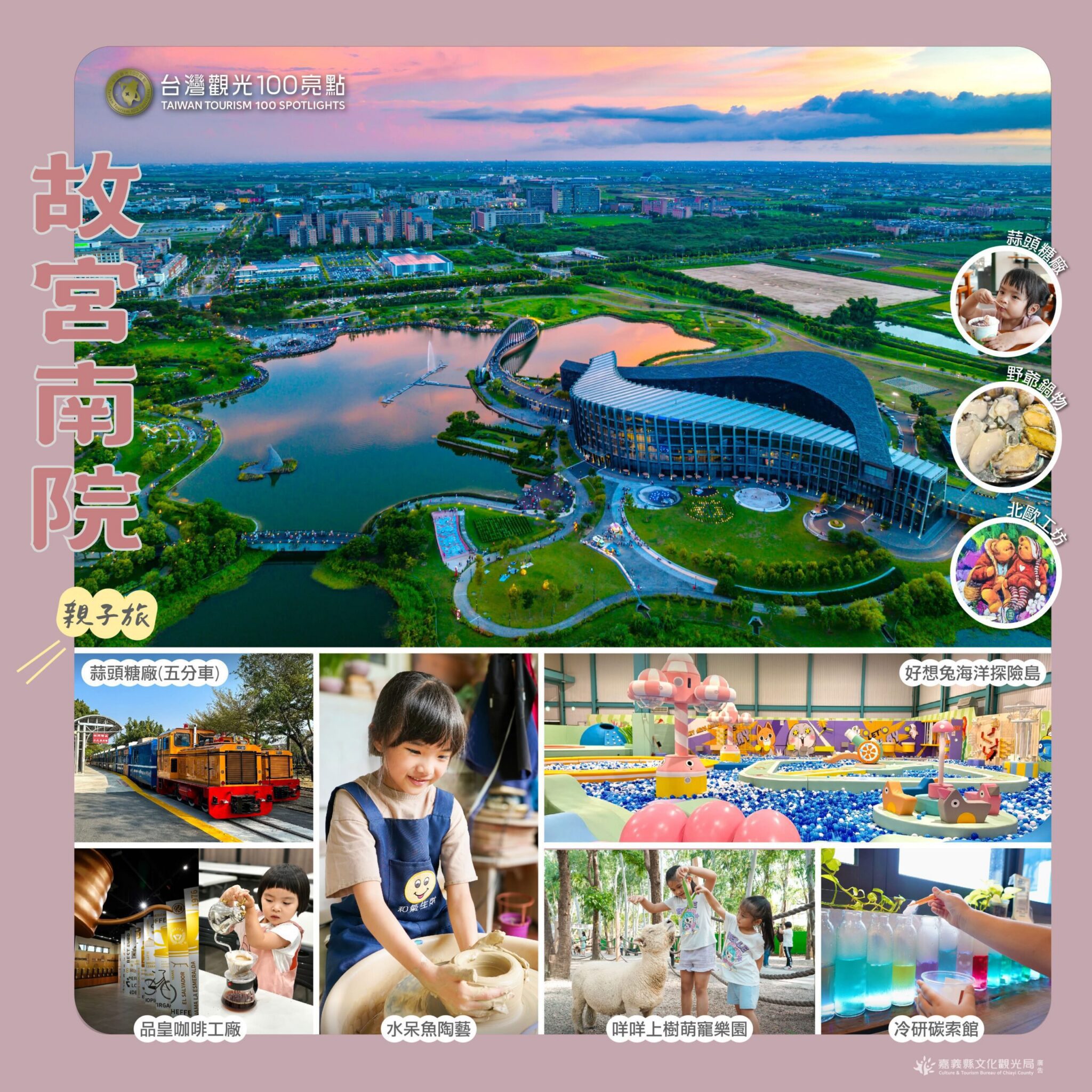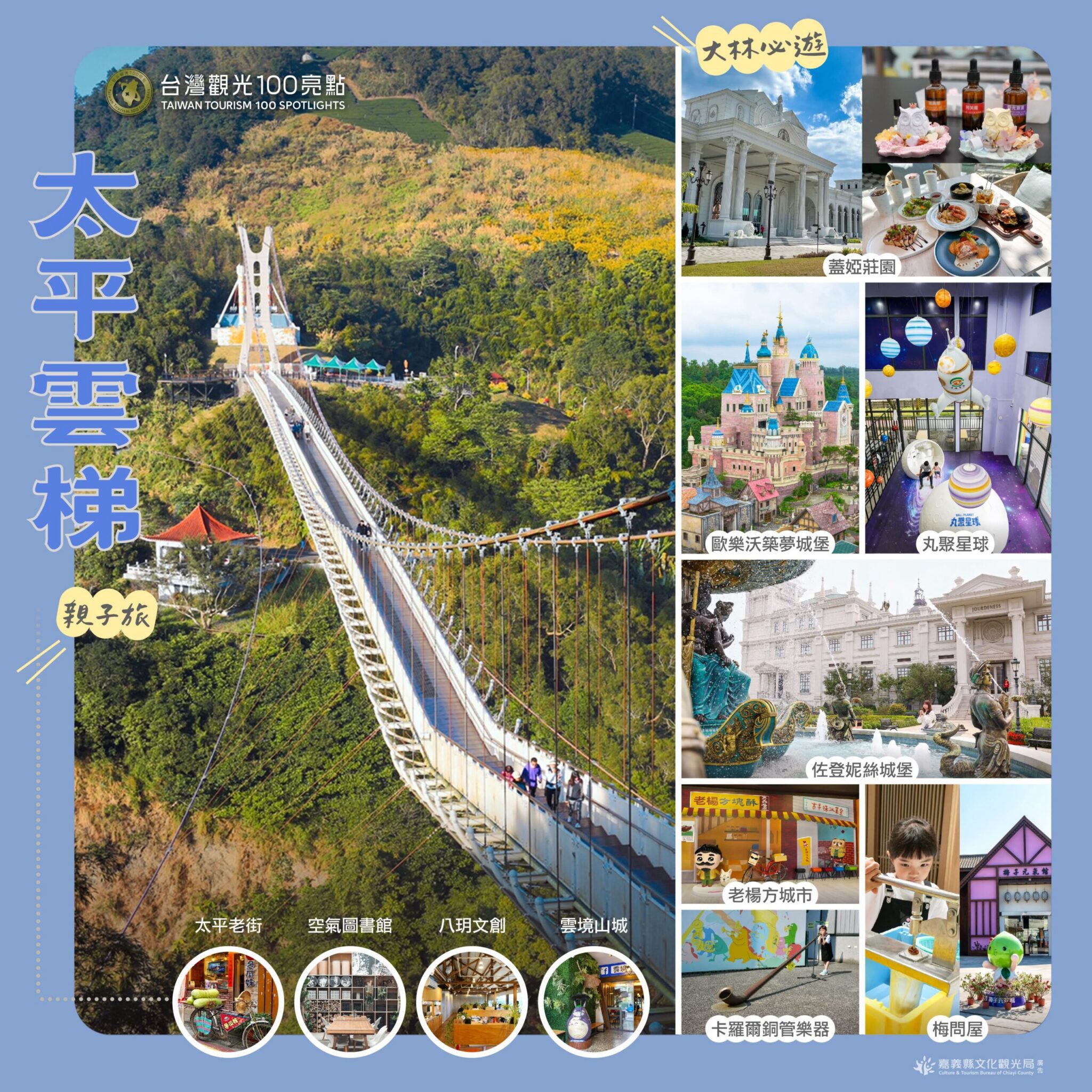 暑假快結束,但超密集假期要來了,今年10月極罕見有3個連假,還沒想好去哪玩嗎?嘉義縣文化觀光局精選 「台灣觀光100亮點」嘉義縣入選景點「阿里山森林鐵道」、「太平雲梯」、「二延平步道」、「奮起湖」、「逐鹿文創園區」、「故宮南院」,每一趟都不無聊,大人小孩盡情享受。