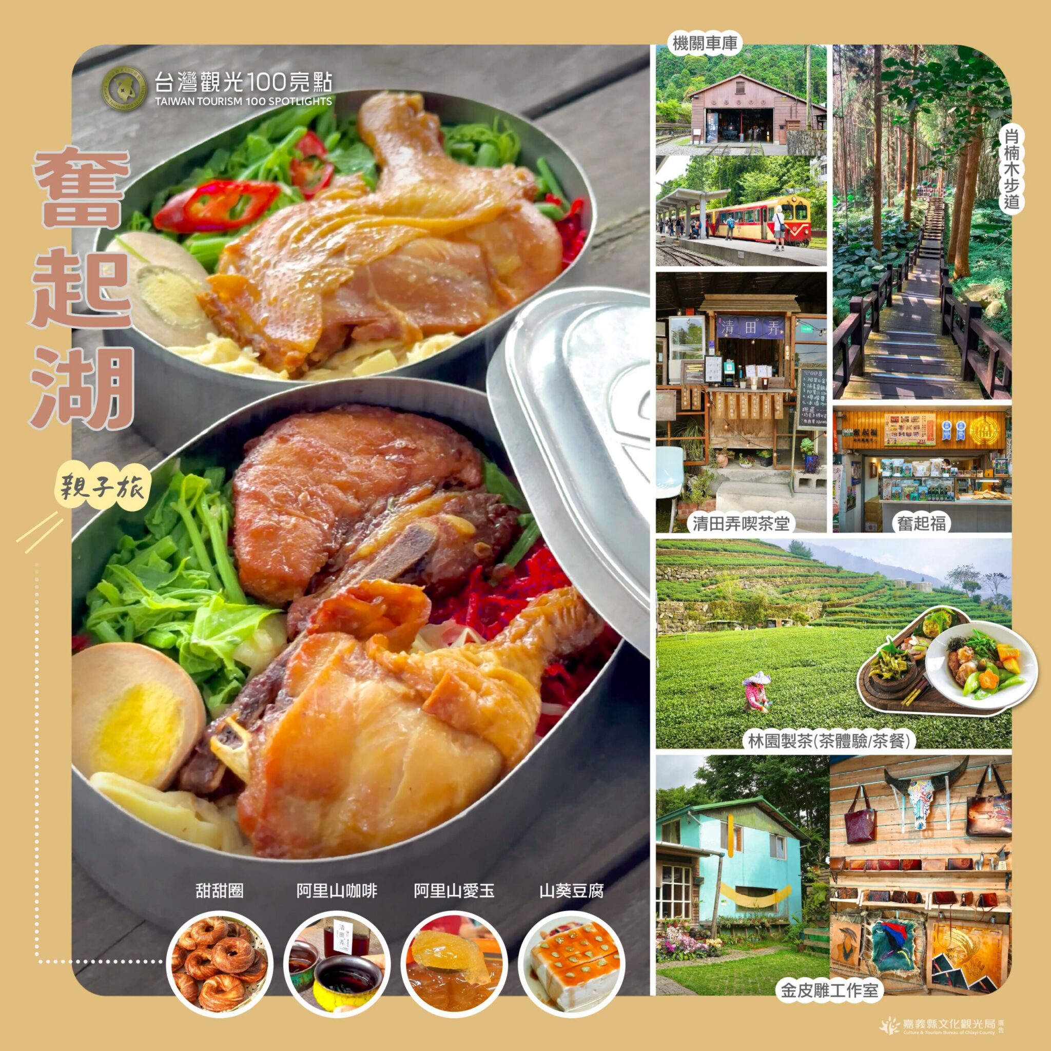 文觀局推薦山林系、網美必收、在地原味、DIY體驗等親子旅遊提案,包括阿里山森林遊樂區每週三「沼平線」限定檜木車廂,搭上主題列車「福森號」、「栩悅號」,享受鐵道旅行的浪漫,並探訪幾個經典車站。