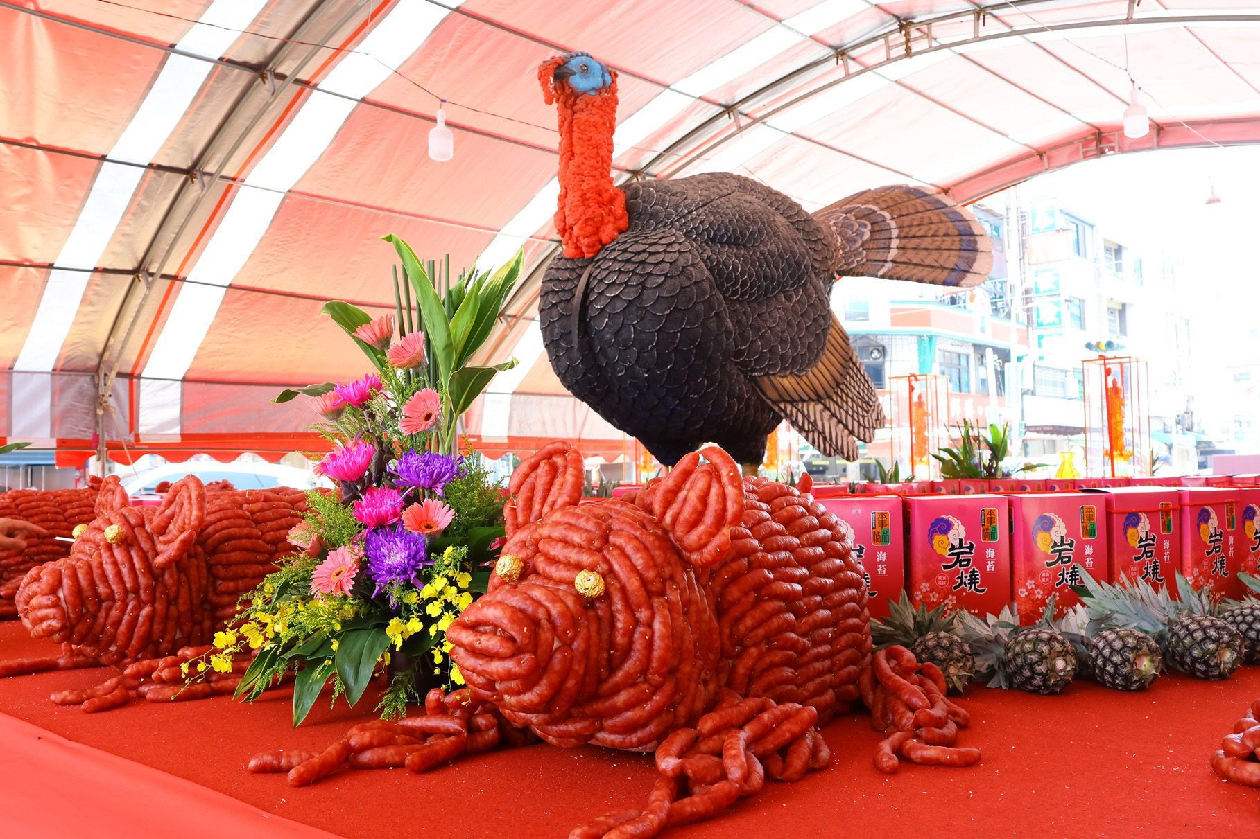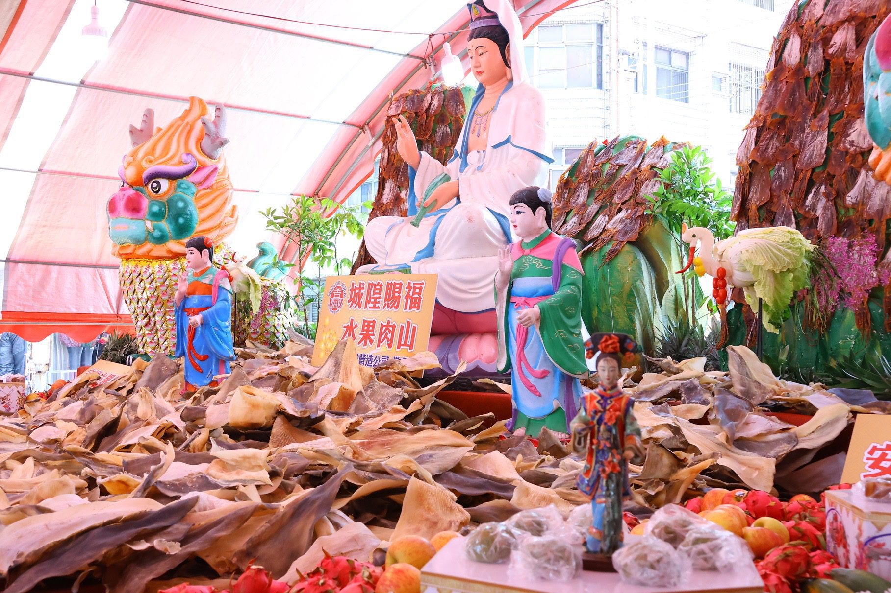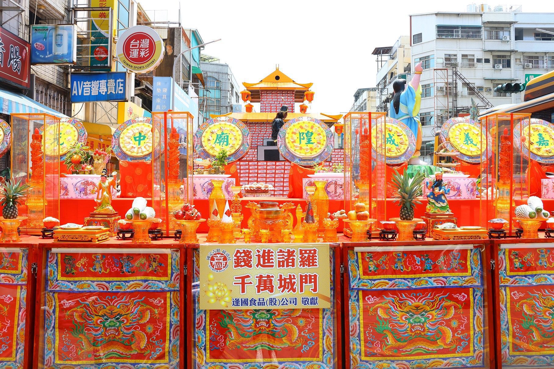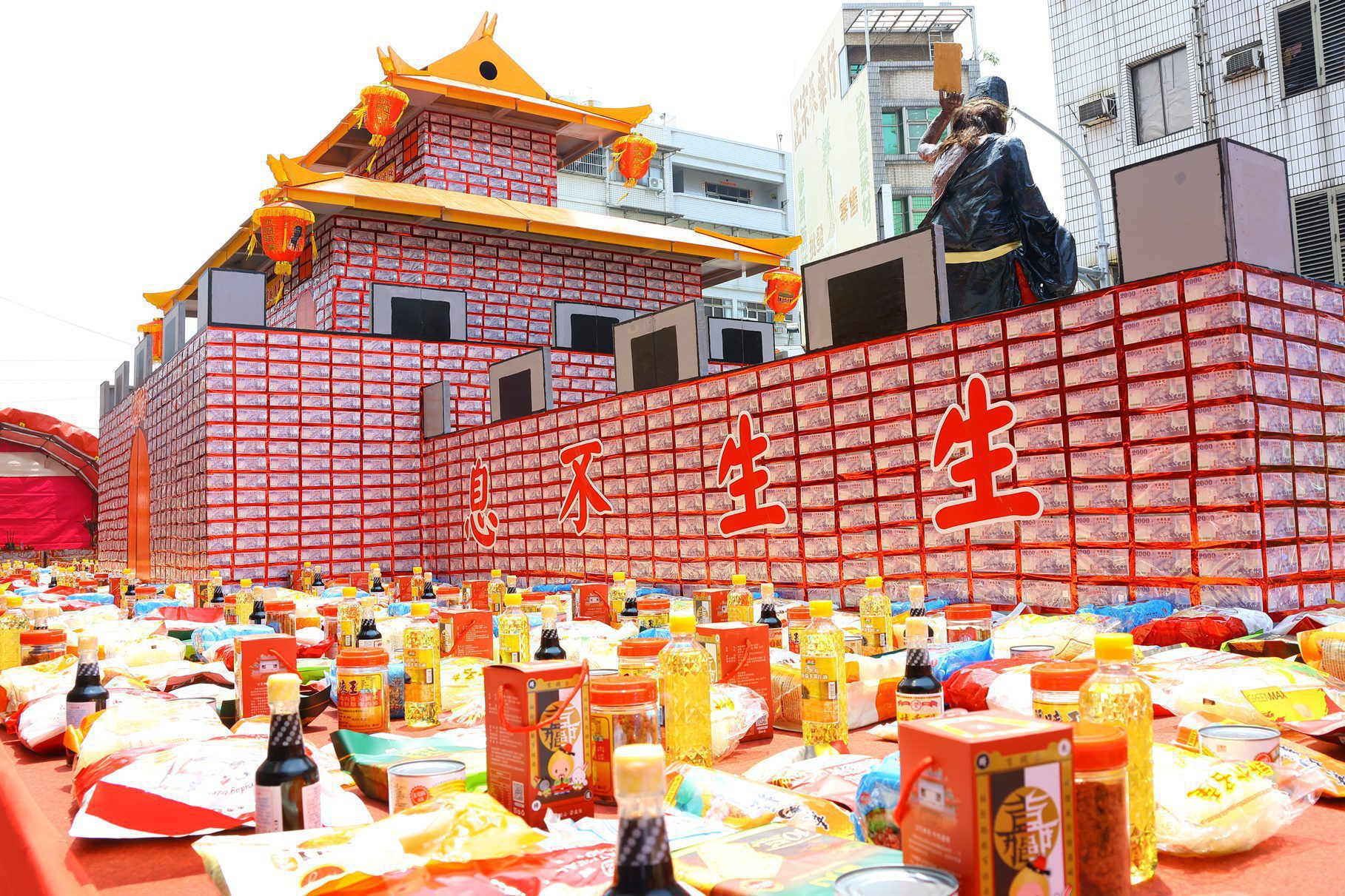 今年祭典除傳統供品外,更融入嘉義特色產品,規劃七大主題景觀,其中最吸睛的莫過於以7,500張兩千元紙鈔堆砌、總值1,500萬元的「錢進諸羅 千萬城門」,吸引民眾駐足拍照討論。此外,結合水果、豬肉、烤雞的「水果肉山」,象徵城隍庇佑百姓。此外,也有以嘉義噴水池、大火雞與香腸豬打造的「生生不息 時來運轉」、耆老展現捏麵工藝的「佛國樂嘻」、嘉義魚市場獻上的兩尾180公斤龍膽石斑「魚讚中元」等,展現出傳統與創新的結合,現場氣勢宏偉,吸引各界矚目。