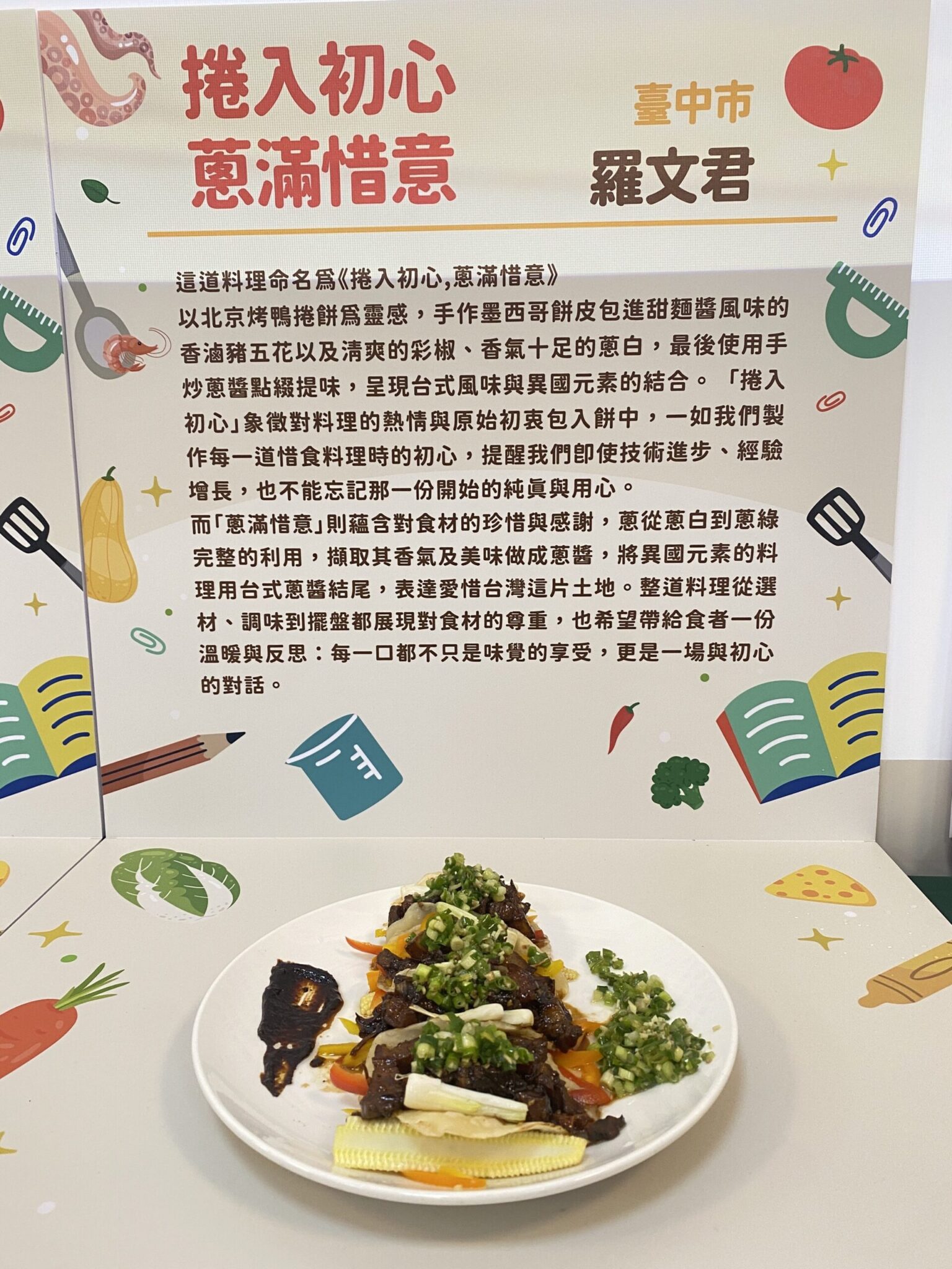 另一道《捲入初心 蔥滿惜意》則以北京烤鴨捲餅為靈感,結合墨西哥餅皮、滷豬五花、彩椒與蔥白,最後以自製蔥醬收尾,融合異國風味與台式元素。她表示,「捲入」象徵將對料理的熱情與初心包裹其中;而「蔥滿惜意」則展現從蔥白到蔥綠的完整利用,表達對食材及土地的珍惜。整道料理不僅是味覺饗宴,更希望引發食者的共鳴與反思。