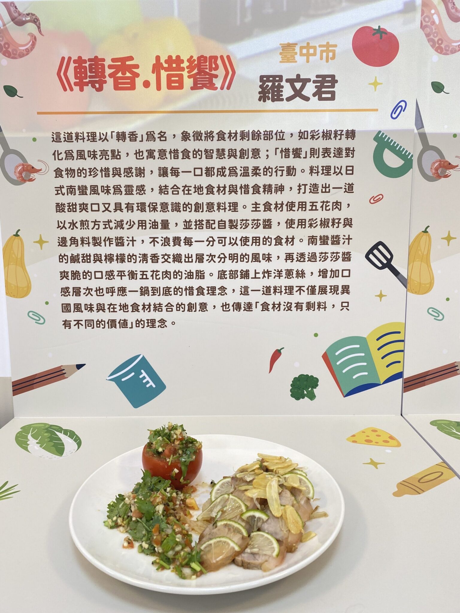羅文君在賽後分享,她以「惜食」精神為核心創作料理。其作品《轉香·惜饗》名稱寓意將彩椒籽等食材剩餘部位轉化為料理亮點,展現惜食智慧與創意;「惜饗」則傳達對食物的感恩。料理取材自日南蠻風味,運用在地食材搭配自製莎莎醬,以彩椒籽與邊角料製作醬汁,層次豐富又兼顧環保,展現「食材沒有剩料,只有不同價值」的理念。