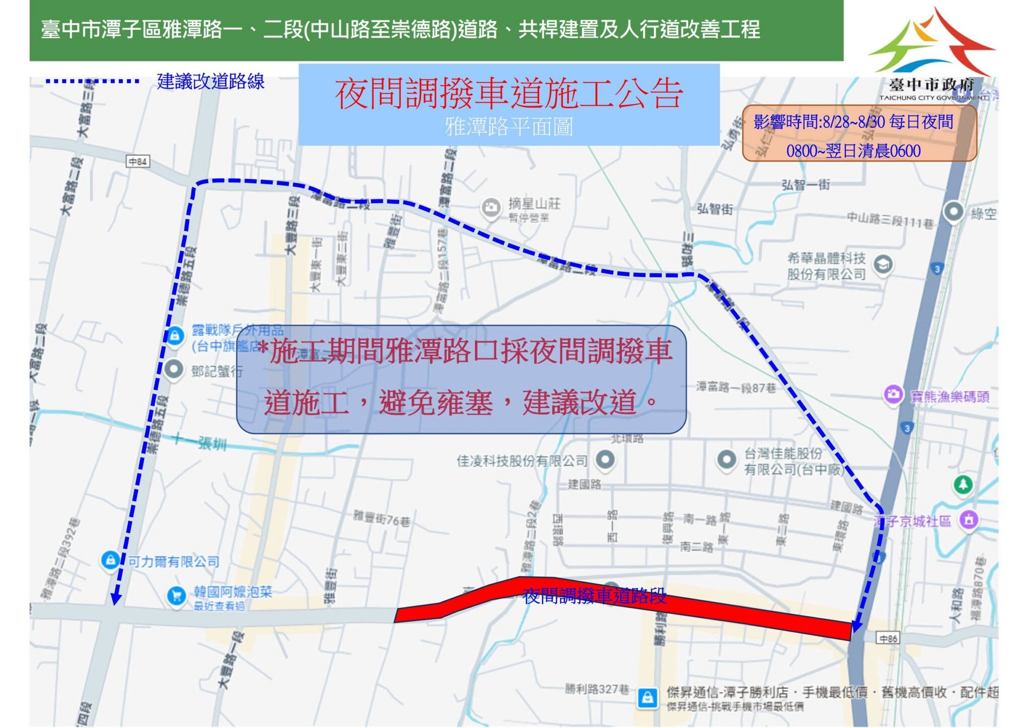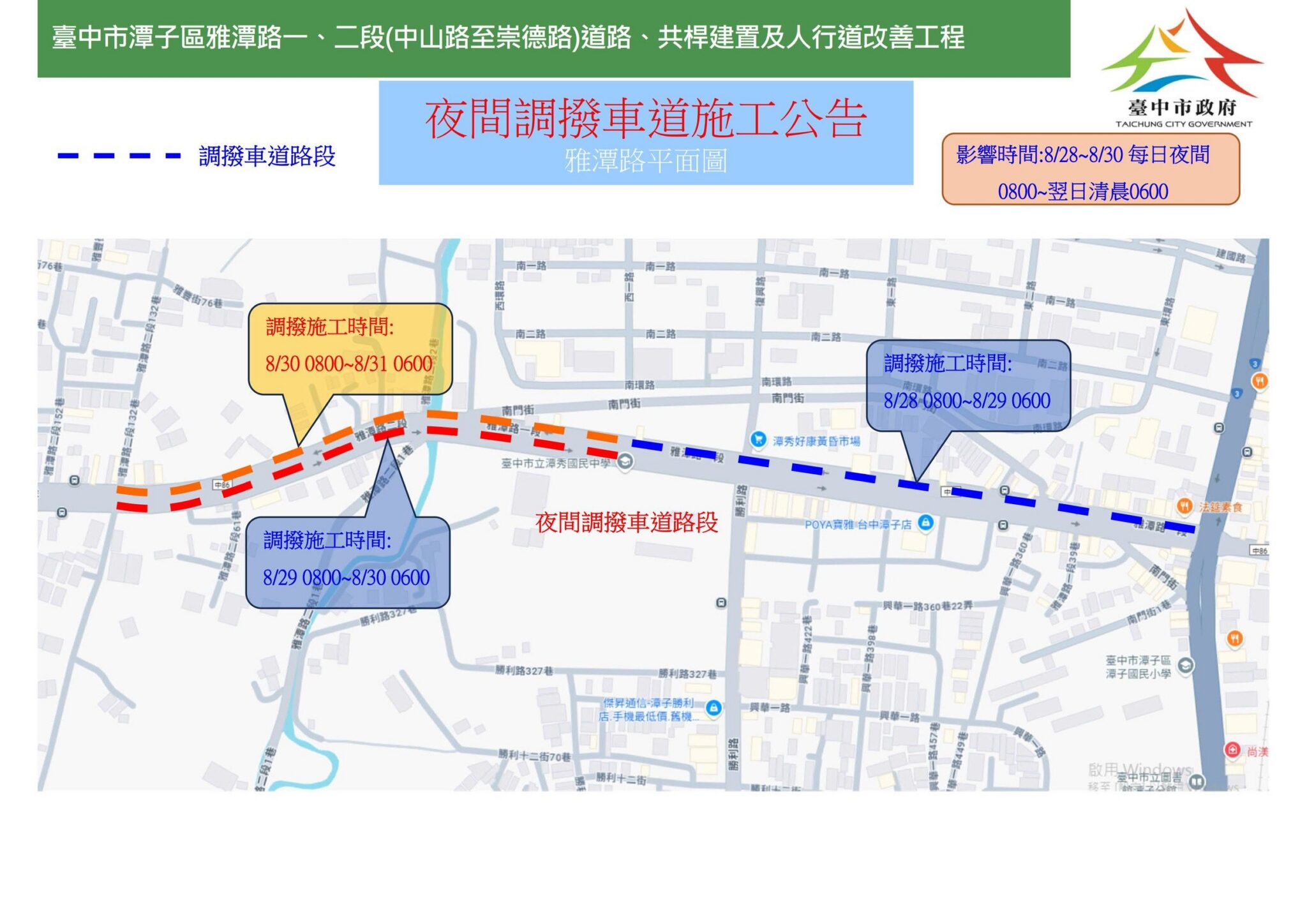 台中市長盧秀燕重視道路品質與行人安全,為改善潭子區雅潭路一、二段沿線通行環境,市府建設局推動「潭子區雅潭路一、二段(中山路至崇德路)道路、共桿建置及人行道改善工程」,為利施工進度,工程團隊將自明(28)日至31日,每晚8時至隔日上午6時,在中山路至雅潭路二段105巷(即132巷)路口區間的南北側路面進行刨鋪作業,市府提醒用路人提前規劃替代路線,注意行車安全。