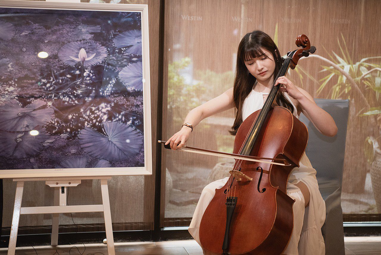 圖說:週年慶開幕現場大提琴家蔡馥伃以優揚樂曲譜出動人繪聲。
