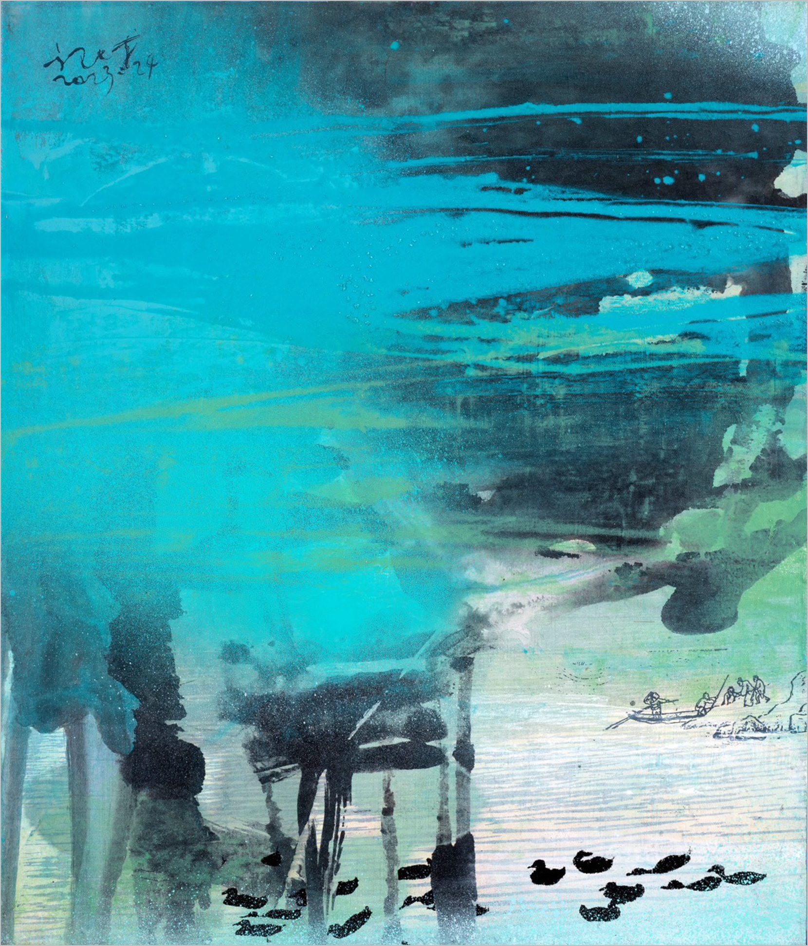 身為好友的簡文秀表示,許多畫家往往從水墨畫或水彩畫入門,轉向抽象創作,是需要更深厚的底蘊、勇氣及才情。這次郭博州個展呈現疫情後的創作轉折,從「生命風景的流動」出發,融合東方山水與西方抽象,傳統跟現代精神,展出70餘幅作品,包含「疫情前傳」、「早春行旅」、「富貴逢時」、「金韻荷風」與「狂草」等系列,畫風大膽鮮明,自成一格,深刻地展現他對生命、自由與自然的關懷。