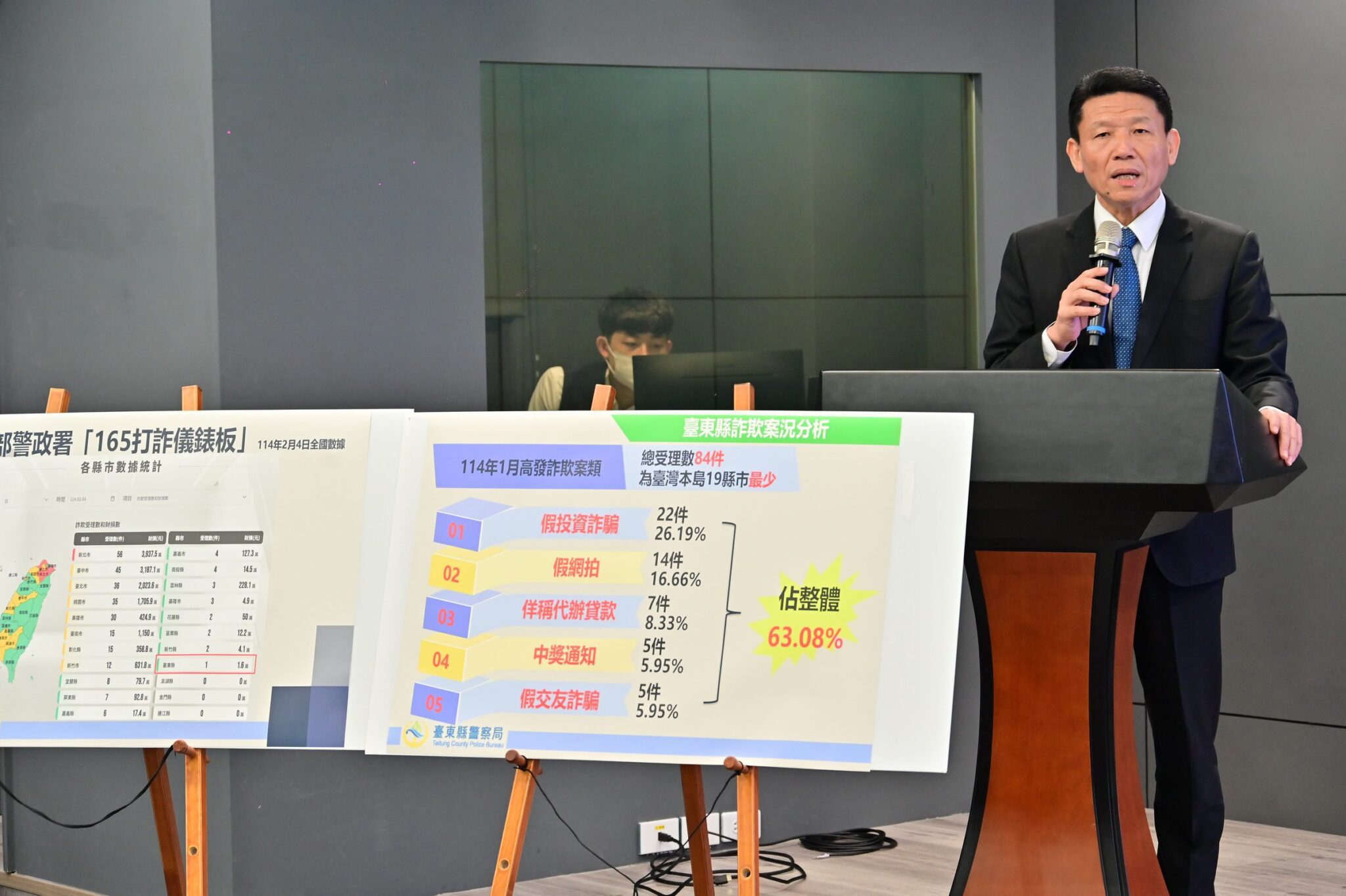警察局長蔡燕明(上圖)說明,臺東縣去(113)年共發生809件詐騙案件,其中「假投資」詐騙占比近三成,財損金額也以此類型最高;然而,相較於本島其他縣市,臺東縣的受理案件數及財損金額均為最低。今年1月詐騙案件數達84件,其中「假投資」詐騙22件,占比26.19%;該月詐騙財損總額達9,493萬餘元,其中「假投資」詐騙占6,892萬餘元,佔比高達72.6%。警方將持續加強打詐與宣導,並希望透過林昱珉的影響力,提升民眾對詐騙手法的辨識能力,減少受害機率。