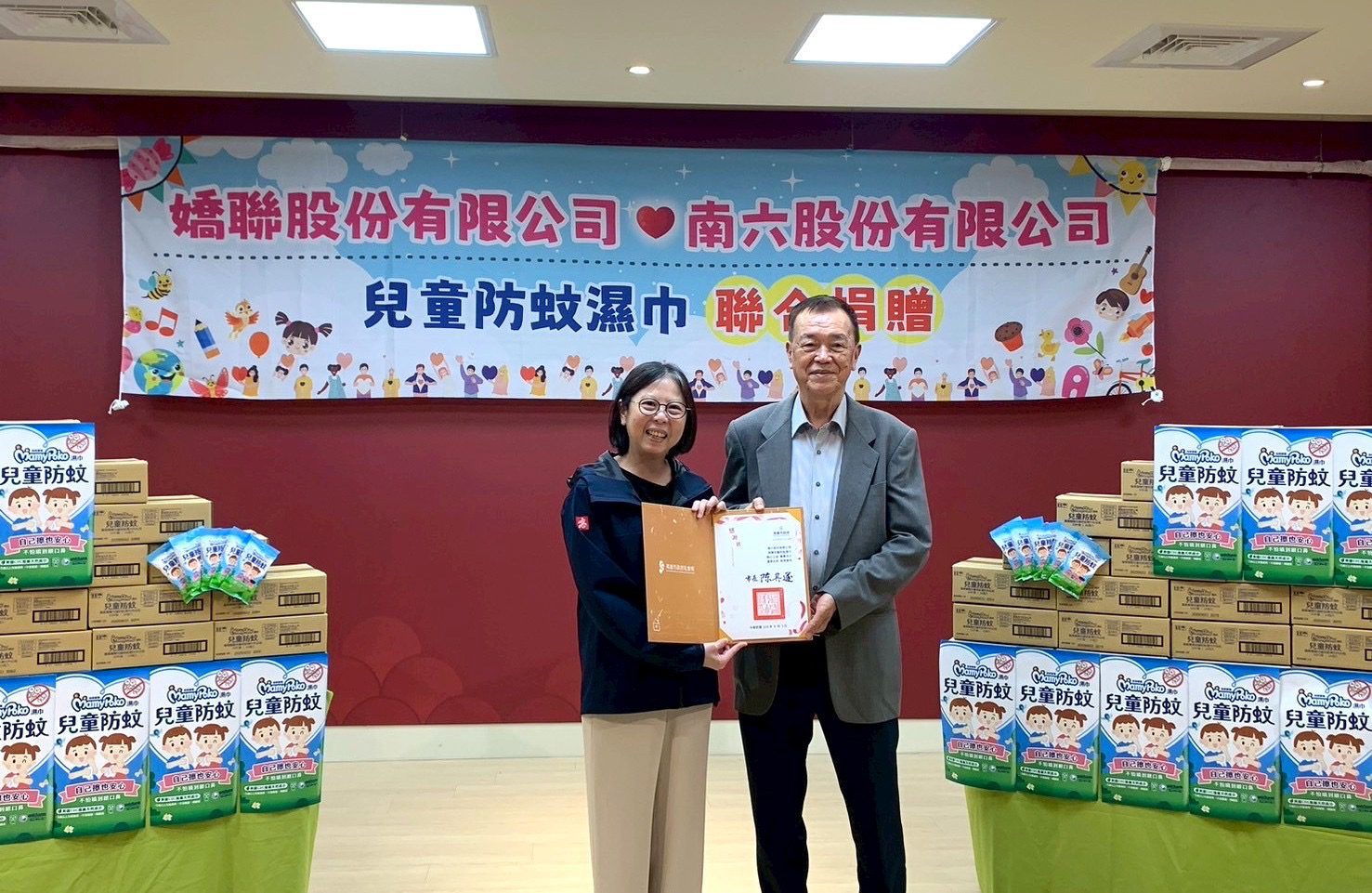 嬌聯股份有限公司楊國柱總經理與南六股份有限公司楊瑞華副董事長今(3)日代表聯合捐贈2萬包的兒童防蚊濕巾,由社會局長蔡宛芬代表受贈,並將分由社會局、環保局、民政局,優先提供予弱勢兒少服務據點、區公所及清潔隊等單位使用,感謝兩大企業善心行動,為孩子們的健康盡一份心力。