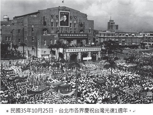 民國26年7月7日抗戰伊始,至民國30年我國獨力抗日奮戰4年餘後,民國30年12月8日,日本偷襲美國夏威夷珍珠港,太平洋戰爭爆發,中國與美、英等國同盟對日作戰。32年11月,中、美、英3國領袖蔣中正、羅斯福及邱吉爾,在開羅舉行會議後發表聯合宣言,確定日本應歸還占領的我國東北、台灣、澎湖等地。34年7月,中、美、英3國共同發布「波茨坦宣言」,要求日本必須履行「開羅宣言」之條件。 8月15日,日本宣布無條件投降,至此艱苦的8年對日抗戰終於獲得勝利,戰後依據「開羅宣言」,台灣重回中華民國懷抱,是我國對日抗戰重大成就之一。10月25日,盟軍中國戰區台灣省受降典禮在台北公會堂(今台北市中山堂)舉行,民國36年3月1日台灣行政長官公署訂10月25日為「台灣光復節」。