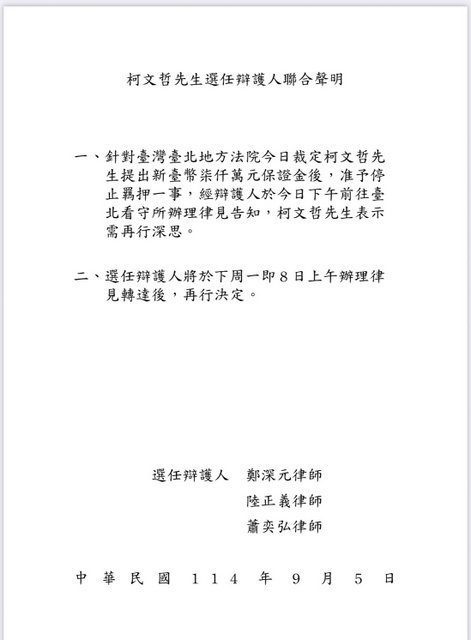 前台灣民眾黨主席柯文哲在台北市長任內涉京華城案,至今已羈押禁見超過一年。台北地院今裁定新台幣7000萬交保。據瞭解,柯文哲可動用的錢只剩下約不到5000萬元,因此柯先前就表態不願高額交保,也不希望向他人借錢。柯文哲透過律師發表聲明,柯文哲表示需再行深思,將於8日上午辦理律見轉達後,再行決定。 台北地方法院審理京華城案,今天裁定,前台北市長柯文哲以新台幣7000萬元交保、台北巿議員應曉薇以3000萬元交保,須科技監控(電子腳鐐),均限制住居、限制出境、出海,不得接觸本案被告、證人。台北地檢署表示,將待收到裁定理由後,研議是否提起抗告。 柯文哲先生選任辯護人聯合聲明如下: 一、針對台灣台北地方法院今日裁定柯文哲先生提出新台幣柒仟萬元保證金後,准予停止羈押一事,經辯護人於今日下午前往台北看守所辦理律見告知,柯文哲先生表示需再行深思。ﻩ 二、選任辯護人將於下周一即8日上午辦理律見轉達後,再行決定。 選任辯護人:鄭深元律師、陸正義律師、蕭奕弘律師。 (中評社台北9月5日電)