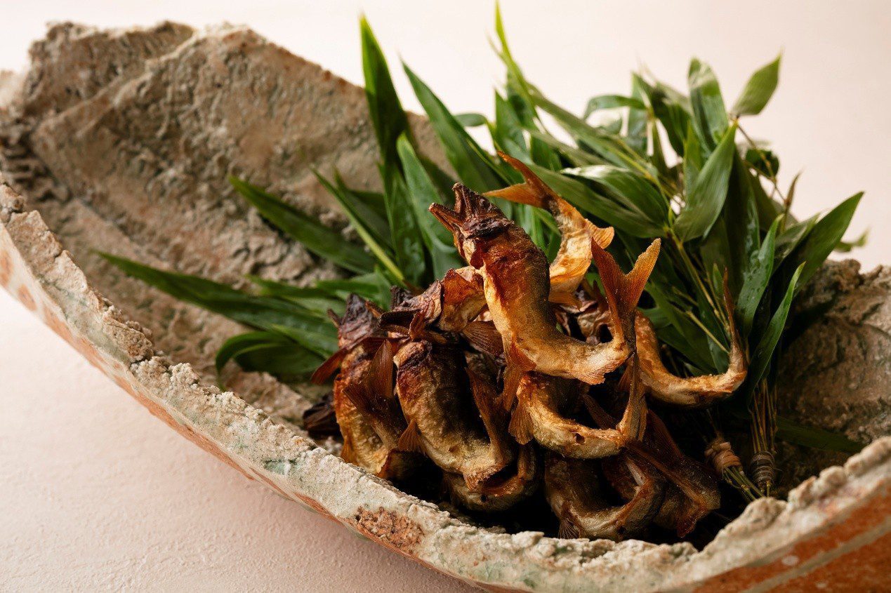 盛於燒締陶器中的烤物。酥香四溢的烤香魚彷彿在綠葉綴映的季節中樂游。 圖片提供:銀座 小十
