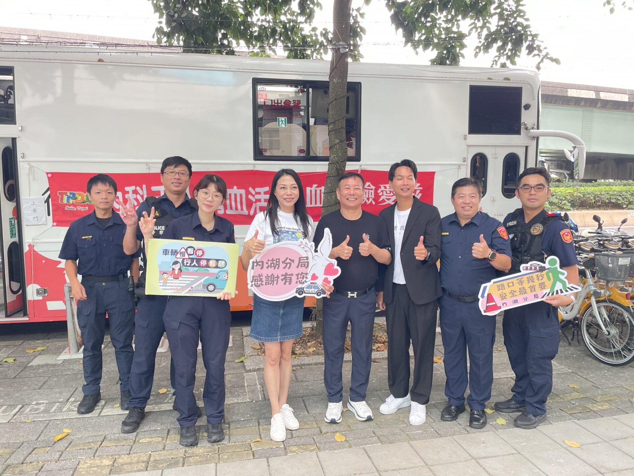 「內湖警會講」宣導團參加公益捐血活動,現場除了有熱心民眾響應,也同步設置交通安全宣導專區,讓參與者在捐血同時,更能吸收實用的交通安全觀念。