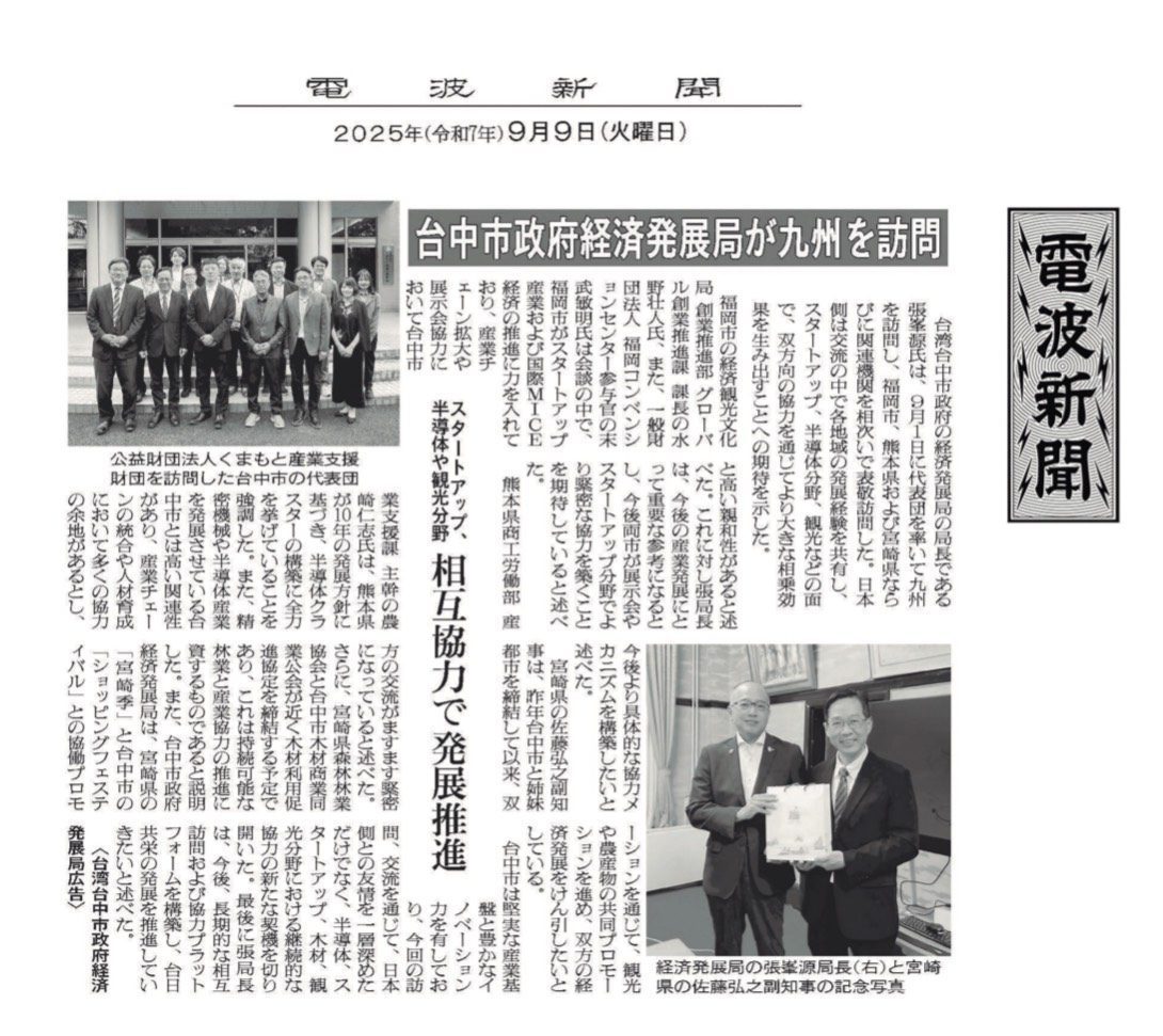 台中市政府經濟發展局長張峯源於9月1日率團赴日本九州市政參訪,推動新創、半導體、林業及觀光等多面向交流。張局長表示,此行前往姊妹市宮崎縣,受到當地盛情接待,並獲日本媒體高度關注,宮崎電視台與電波新聞相繼報導,肯定台中市長盧秀燕積極推動產業發展與國際交流的施政成果。