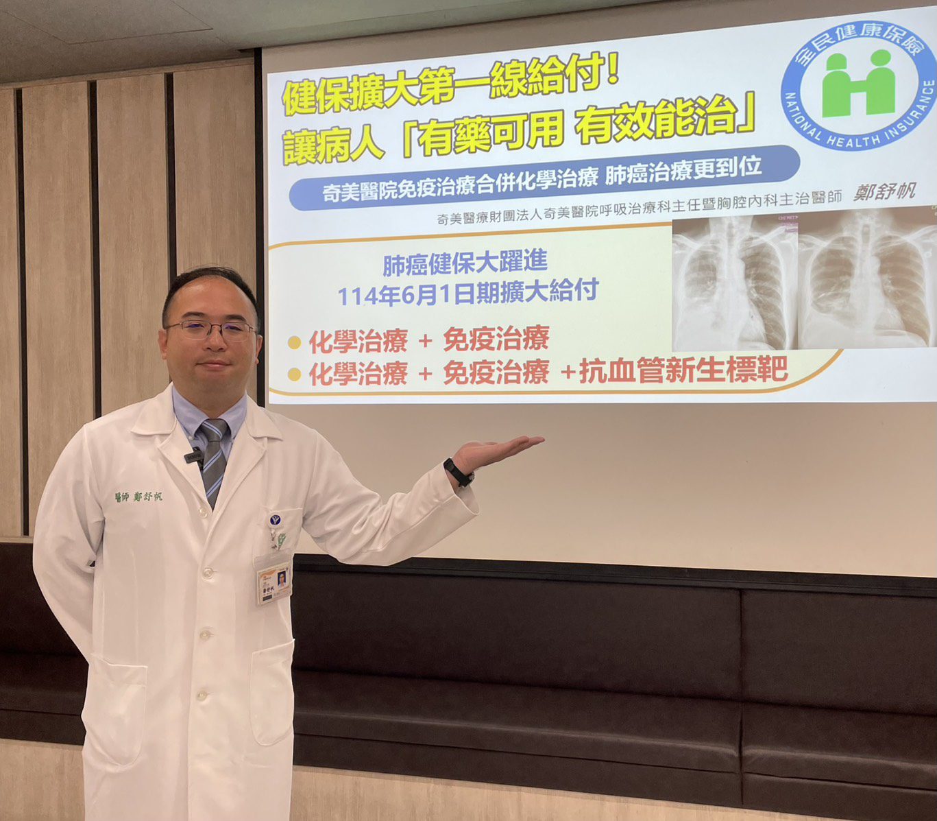 奇美醫院呼吸治療科主任暨胸腔內科主治醫師鄭舒帆指出,國人肺癌晚期確診比例偏高,為了補足過去無EGFR(表皮生長因子受體)、ALK(間變性淋巴瘤激酶)等基因突變病人的用藥缺口,健保署自今(114)年6月1日起,擴大第一線給付「免疫治療合併化學治療」與「化學治療合併免疫與血管新生抑制劑」,估計每年將有1,600名病人受惠,每人可望年省約200萬元藥費。
