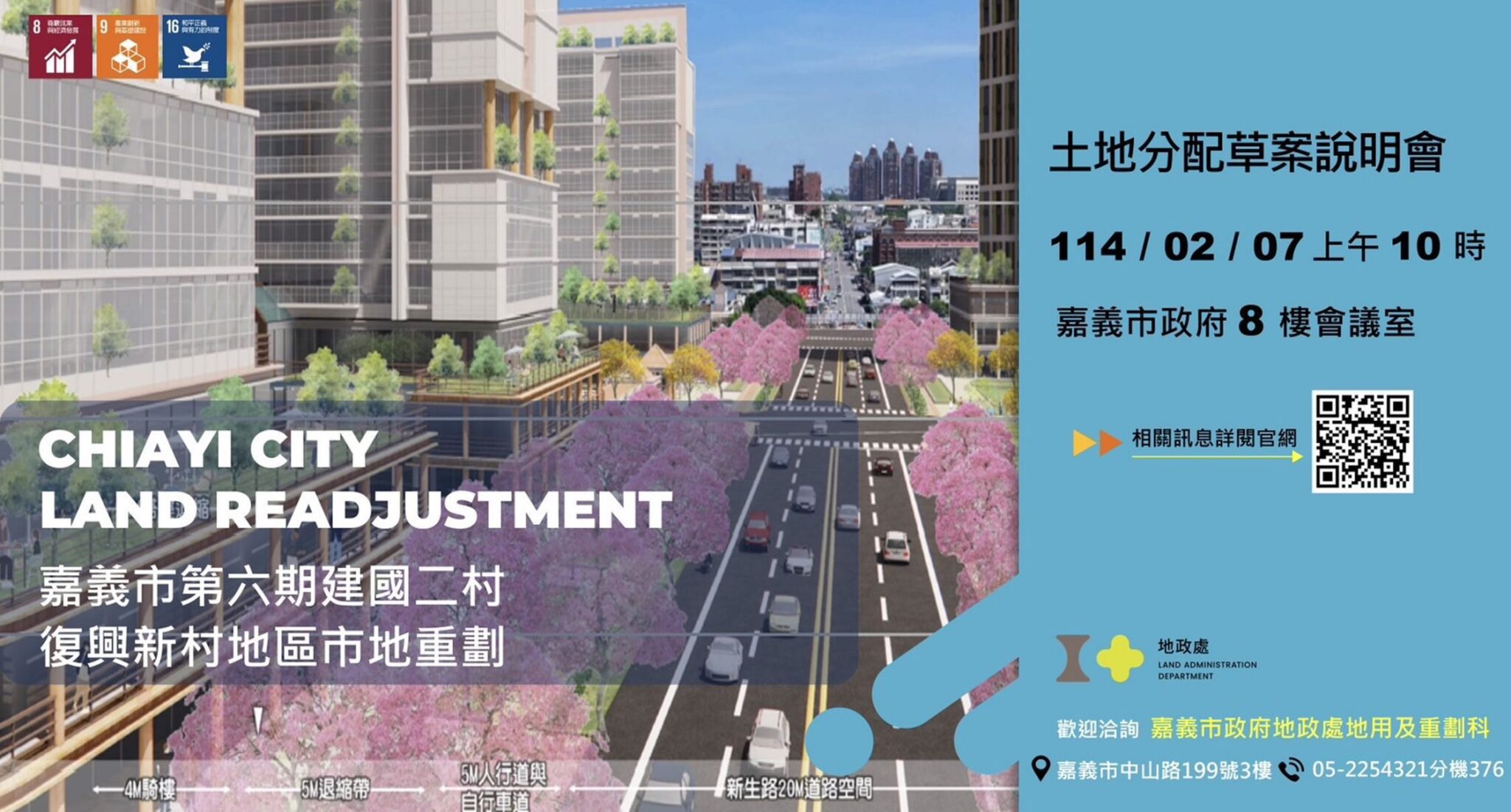 嘉義市政府於4年前(110)啟動面積約達9.3公頃的嘉義市建國二村、復興新村市地重劃工程,工程的核心道路—新生路於去(113)年12月30日正式通車啟用。今(7)日,於市府召開建國二村、復興新村地區舉辦市地重劃土地分配(草案)說明會,說明土地分配依據、調整分配原則並聽取土地所有權人意見。市府表示,未來重劃區將結合周邊園區、串聯文化新絲路軸帶,融合美景、商業、藝文、永續,打造「嘉義信義新興商業區」。