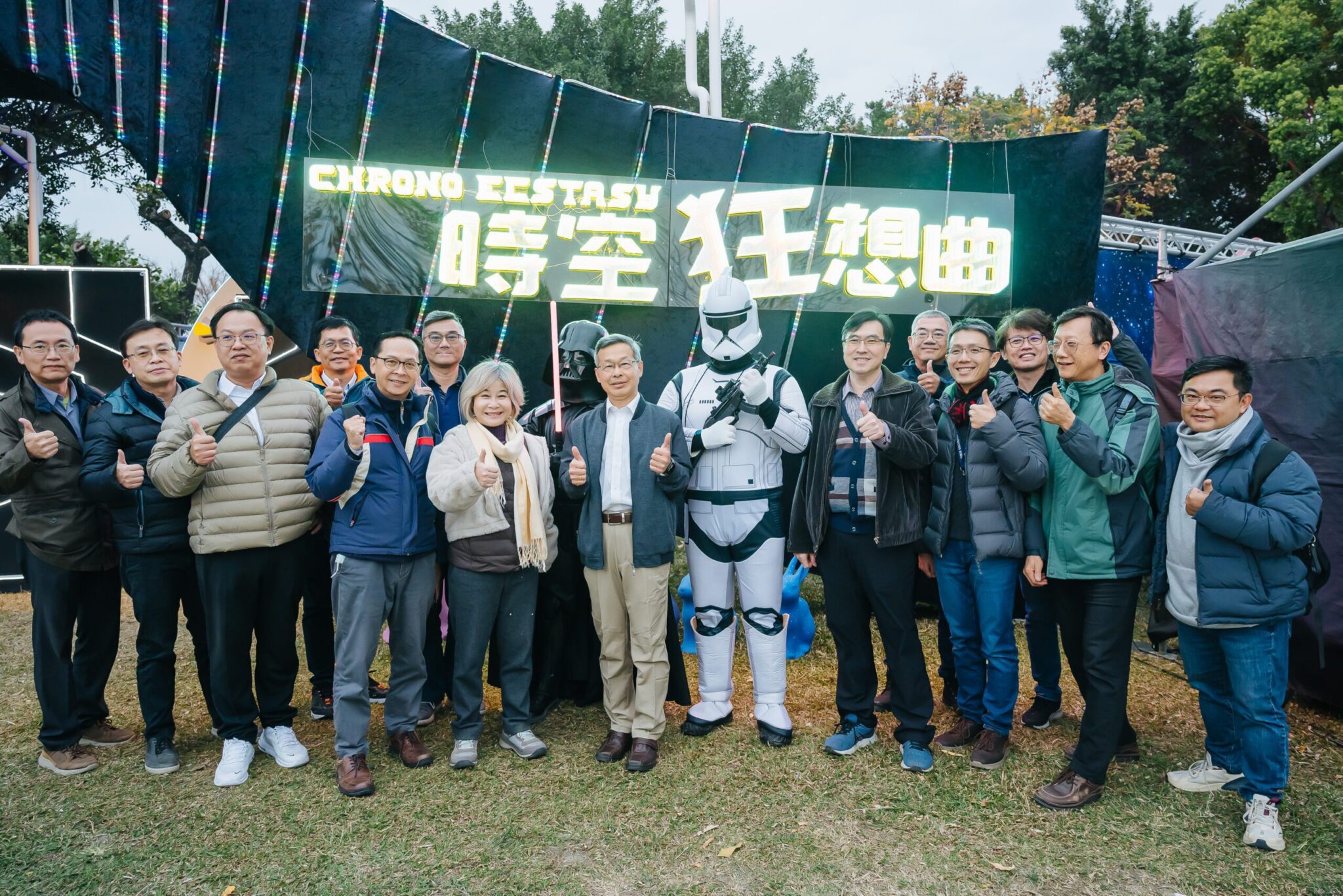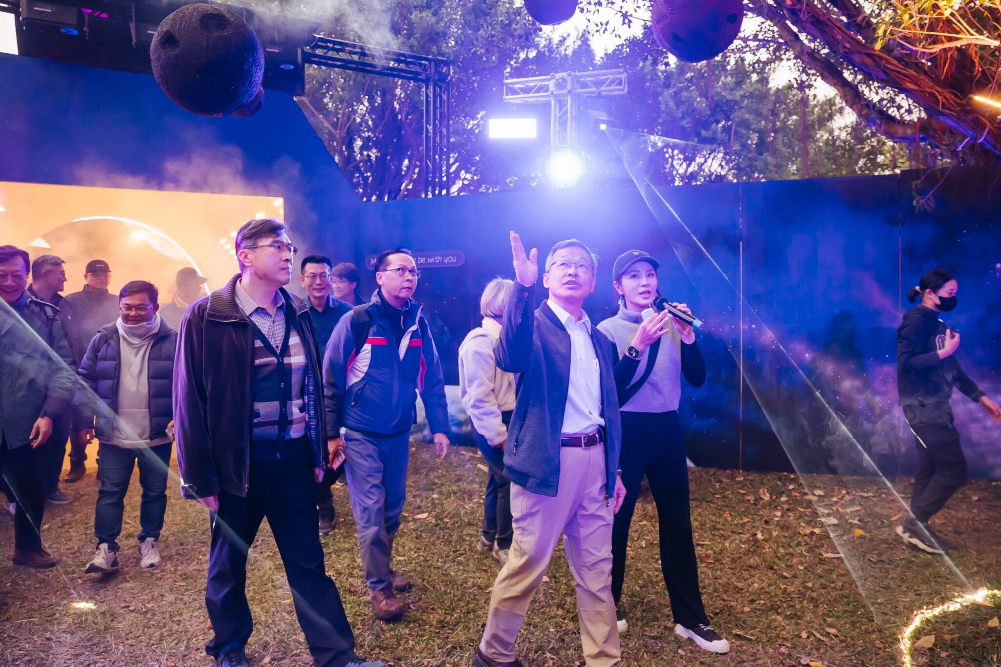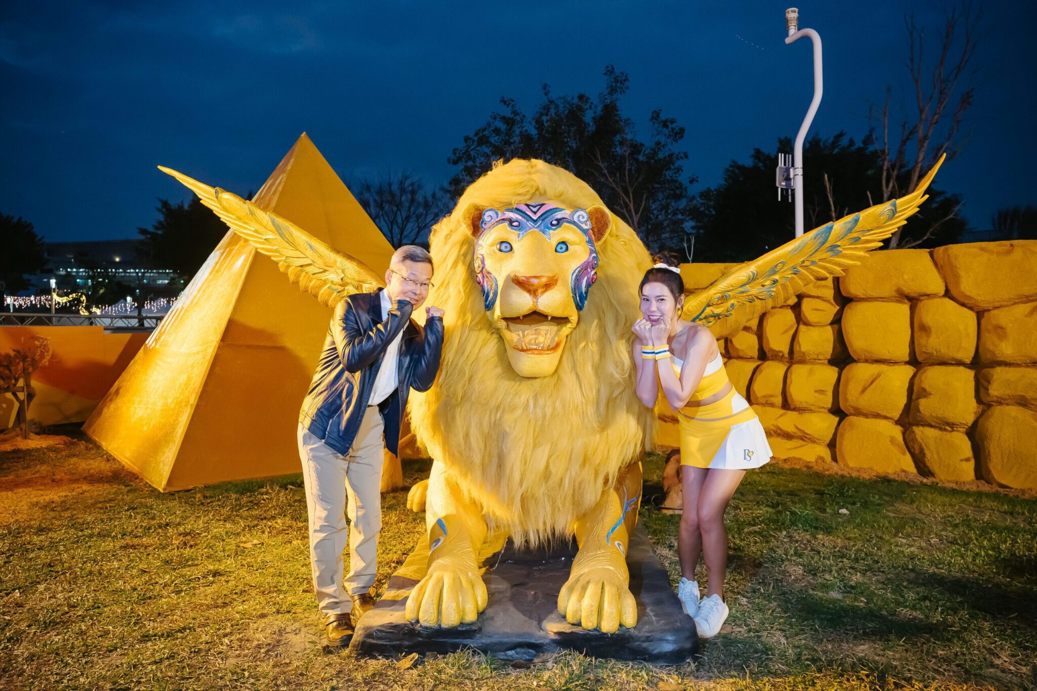 陳局長進一步說明,進入展區後,首先穿越「星際艙門」,步入「時空啟航」區,彷彿置身無重力夢境,漂浮行星環繞四周;接著,經過光束過道,即可走進霓虹閃耀的星際酒吧,與星際DJ及神秘宇宙人一同合影打卡,感受奇幻氛圍;再穿越銀河金字塔,可來到「黃金傳說燈區」,威武的守護獅與太陽神徽章守護著旅人。燈區內展品多由工匠團隊手工打造,重現星際沙漠場景,並結合動物精靈與沙漠時尚動物等元素,帶來獨特視覺饗宴。