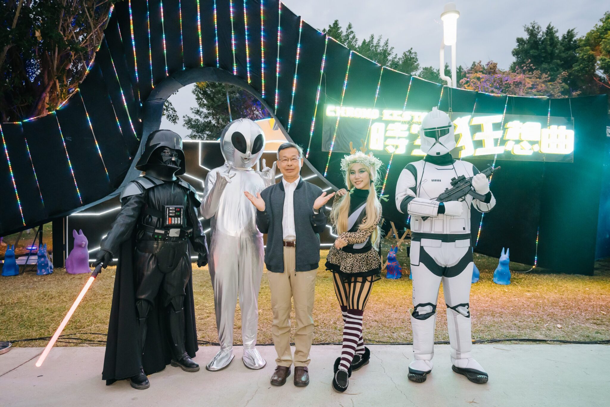 陳局長說明,「時空狂想曲」燈區入口設於僑大八街近經貿五路,首先映入眼簾的是吸睛的迎賓大門「蛇型宇宙之門」,這座大門融合科幻燈光流動與震撼音效,打造出沉浸式視聽體驗,並由手持光劍的星際守衛者引領民眾穿越至平行宇宙時空,成為燈區的必拍亮點之一。