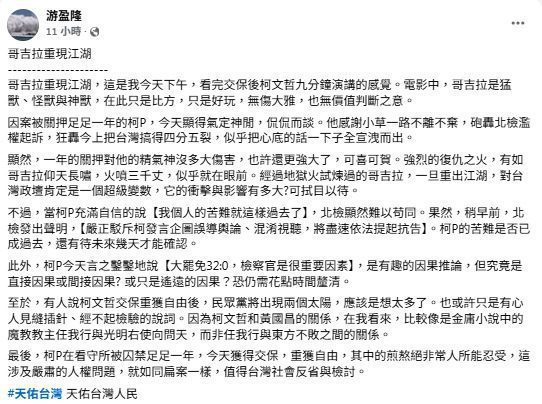 綜合報導/台灣民眾黨前主席、前台北市長柯文哲遭羈押禁見超過一年,8日以新台幣7000萬交保,其發表的簡短談話也引發各界關注。台灣民意基金會董事長游盈隆形容,柯交保後感覺就像“哥吉拉重現江湖”,對台灣政壇的衝擊與影響,肯定會是超級變數,可拭目以待。游提當年民進黨陳水扁案,指柯羈押超過一年,其中煎熬絕非常人能忍受,而這涉及嚴肅的人權問題,值得台灣社會反省與檢討。 游盈隆8日晚間在臉書表示,“哥吉拉重現江湖”,是他看完交保後柯文哲九分鐘演講的感覺。電影中,哥吉拉是猛獸、怪獸與神獸,在此只是比方,無價值判斷之意。因案被關押足足一年的柯文哲,顯得氣定神閒,侃侃而談。他感謝小草一路不離不棄,砲轟台北地方檢察署(北檢)濫權起訴,狂轟賴清德把台灣搞得四分五裂,似乎把心底的話一下子全宣洩而出。 游盈隆觀察,一年的關押對柯的精氣神沒多大傷害,也許還更強大了,可喜可賀。強烈的復仇之火,有如哥吉拉仰天長嘯,火噴三千丈,似乎就在眼前。經過地獄火試煉過的哥吉拉,一旦重出江湖,對台灣政壇肯定是一個超級變數,它的衝擊與影響有多大?可拭目以待。 游盈隆指出,當柯充滿自信的說“我個人的苦難就這樣過去了”,北檢顯然難以苟同。果然,北檢發出聲明,“嚴正駁斥柯發言企圖誤導輿論、混淆視聽,將盡速依法提起抗告”。柯的苦難是否已成過去,還有待未來幾天才能確認。柯言之鑿鑿地說“大罷免32:0,檢察官是很重要因素”,是有趣的因果推論,但究竟是直接因果或間接因果?或只是遙遠的因果?恐仍需花點時間釐清。 游盈隆認為,有人說柯文哲交保重獲自由後,民眾黨將出現兩個太陽,應該是想太多了。或許只是有心人見縫插針、經不起檢驗的說詞。因為柯文哲和黃國昌的關係,比較像是金庸小說中的魔教教主任我行與光明右使向問天,而非任我行與東方不敗之間的關係。 游盈隆提醒,柯文哲在看守所被囚禁足足一年,8日獲得交保,重獲自由,其中的煎熬絕非常人所能忍受。這涉及嚴肅的人權問題,就如同扁案一樣,值得台灣社會反省與檢討。