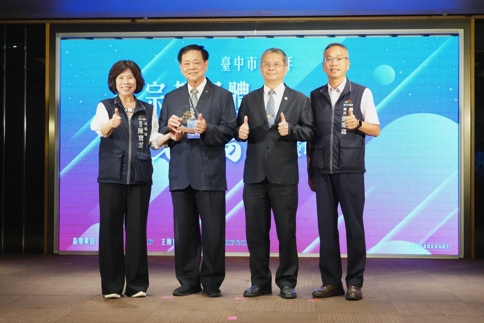 台中市政府民政局今(10)日舉行「114年宗教團體及孝行楷模表揚大會」,表彰全市28名孝行楷模的善行事蹟,以及170家積極參與公益並響應環保政策的宗教團體。民政局副局長陳寶雲代表市長盧秀燕出席頒獎,肯定孝行楷模弘揚孝道,帶動孝悌感恩的良善風氣,並感謝宗教團體以慈善為志,長期投入社會服務,盼藉由此次表揚拋磚引玉,凝聚更多宗教團體投入社會公益與節能減碳,攜手打造永續幸福城市。