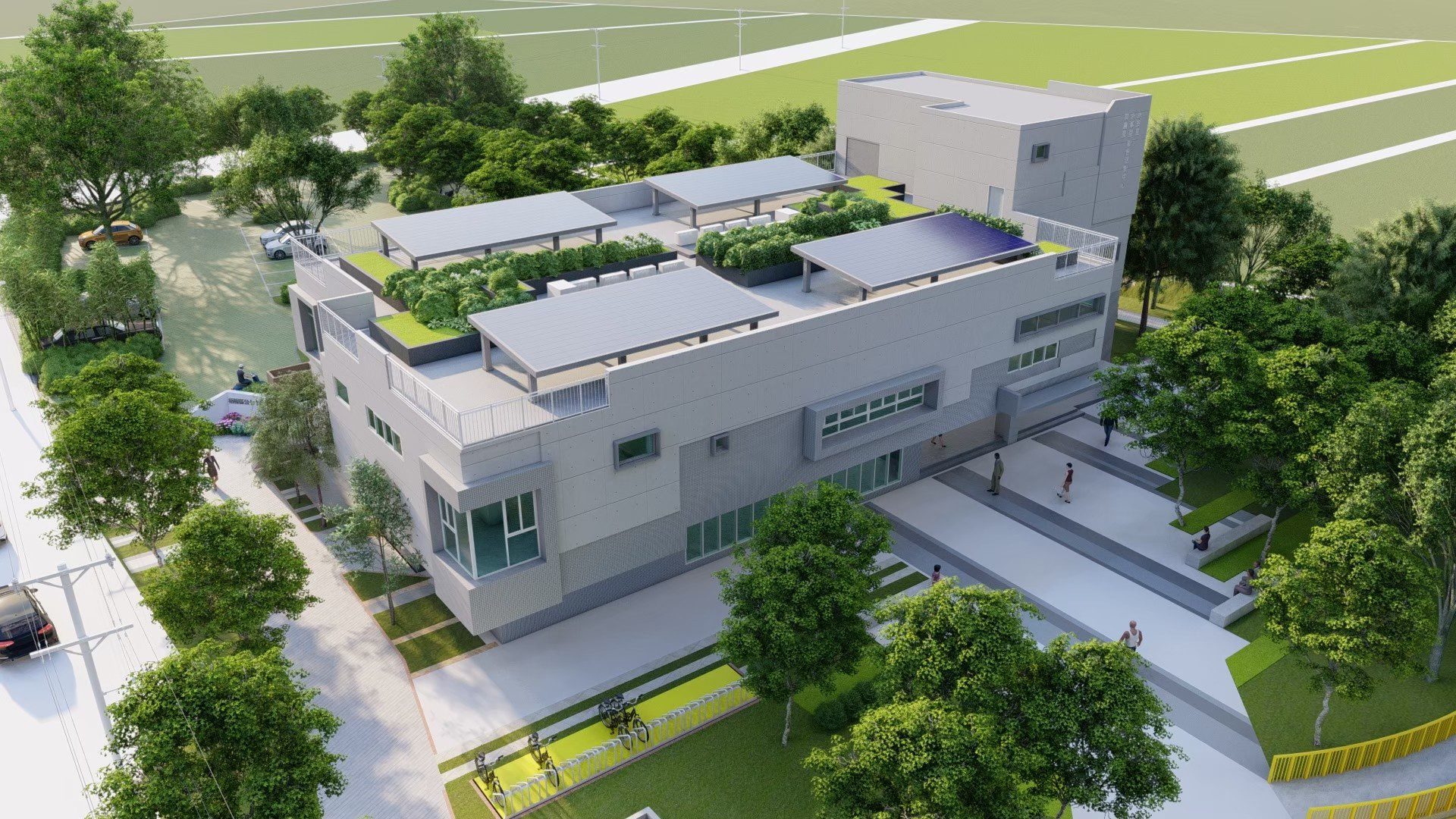 陳局長進一步補充,工程同步施作的「鴨母寮公園」也備受期待。公園設計特色包括四周退縮4公尺形成開放空間,規劃200公尺環形步道,串聯社區動線、通學步道與安全綠帶,並以複層植栽打造緩衝帶,兼具隔離、安全與綠美化功能,讓民眾散步或慢跑時享有開闊視野。園區更設有停車場、籃球場、全齡體能區、兼具滯洪功能的槌球場及親子遊憩空間,未來將成為居民休閒、運動的新選擇,實踐「富市台中,新好建設」願景。