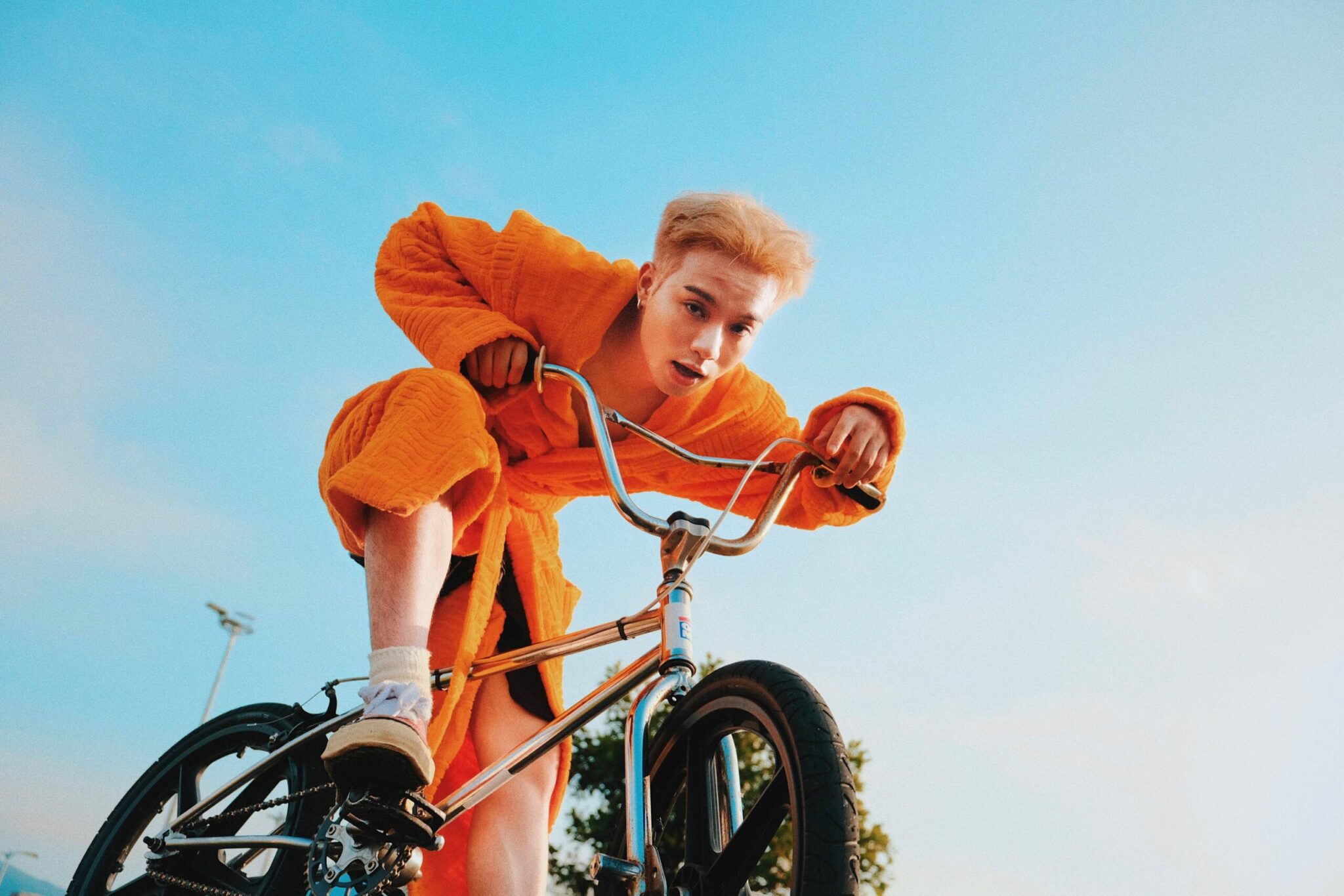 黃號拍MV穿著浴袍在河濱公園騎特技腳踏車    照片提供:山夏國際娛樂