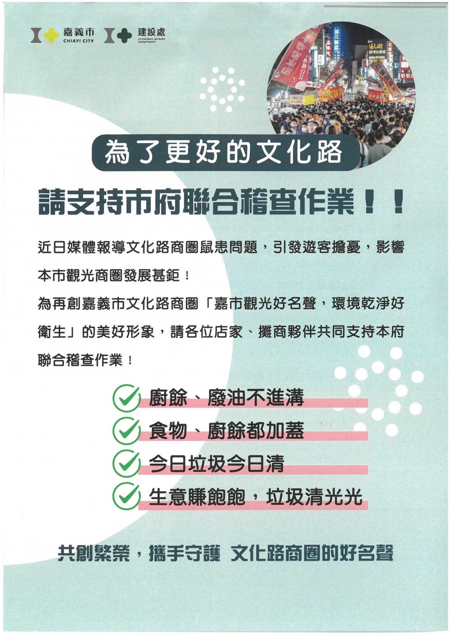 嘉義市政府於本月8日召開「文化路夜市暨中正路商圈油汙源頭管理機制」協調會後,正式啟動聯合稽查行動,由建設處主政,會同環保局、衛生局及工務處,針對食品安全、環境衛生及路面佔用等問題展開輔導與稽核作業,全面提升商圈整體品質。