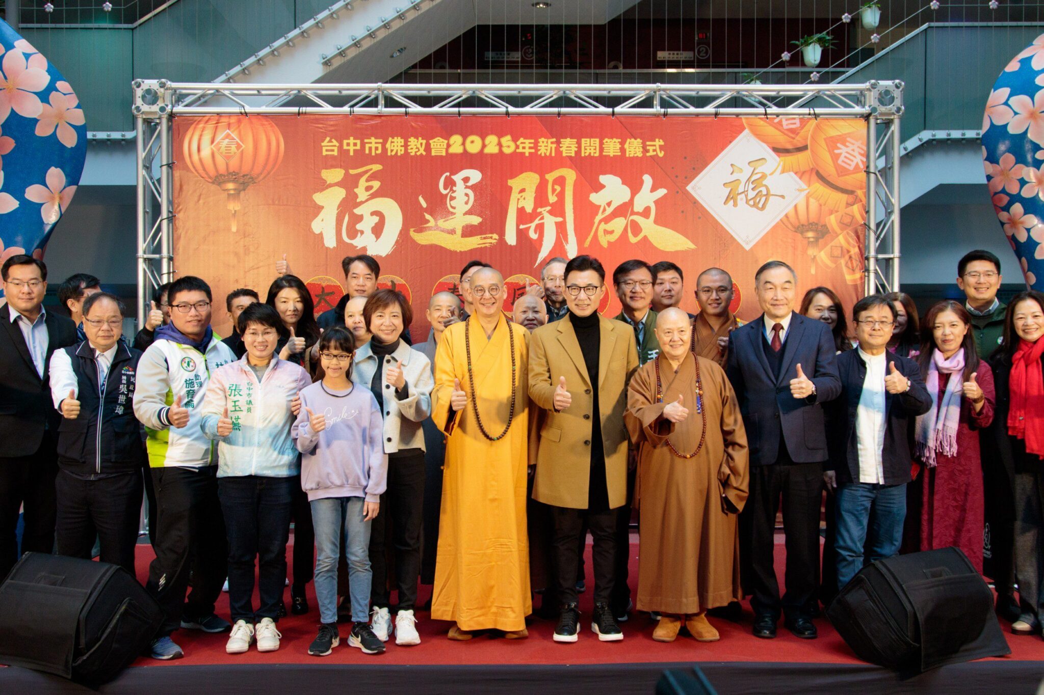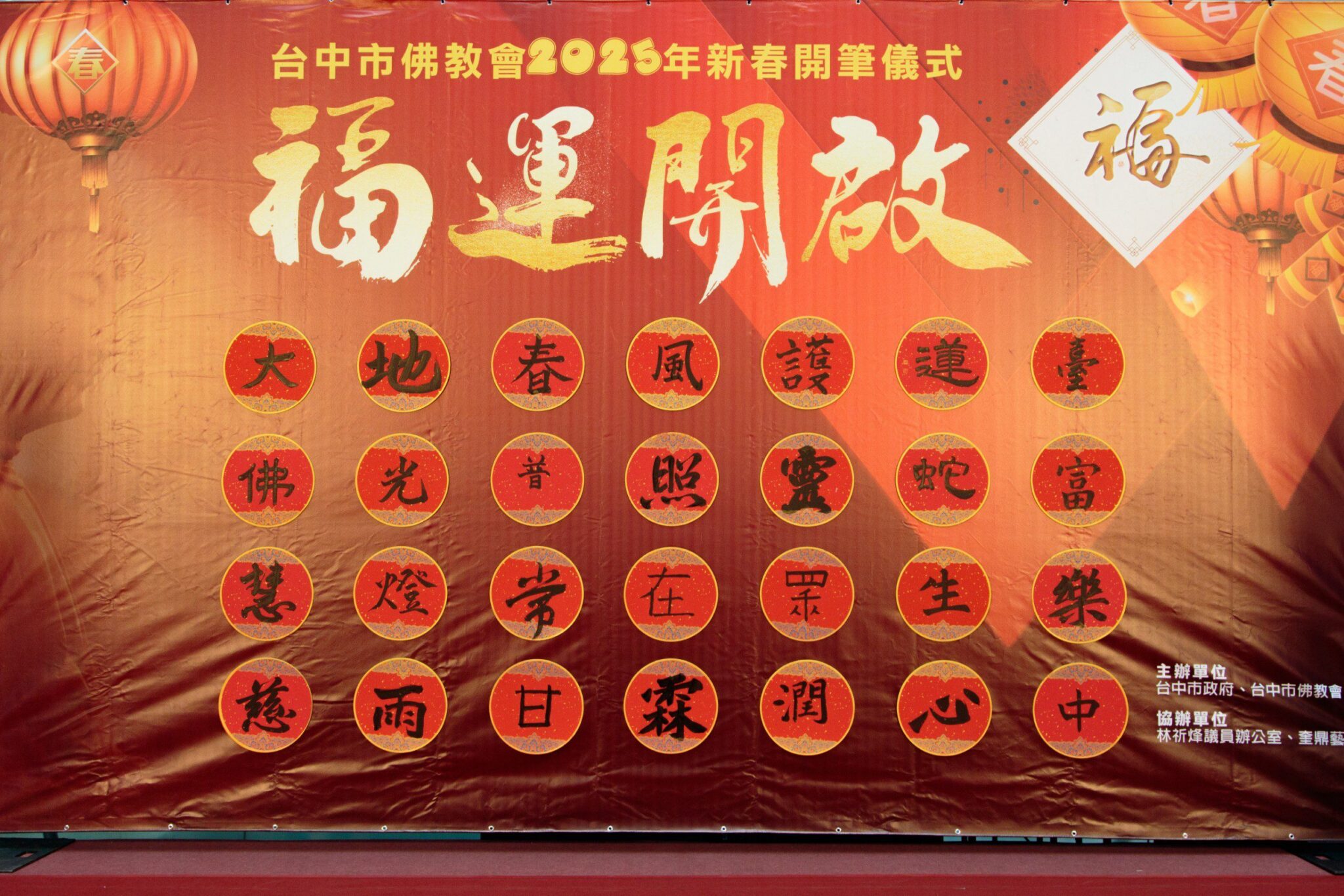 2025年「吉祥金句、福運開啟」新春開筆儀式今日在台灣大道市政大樓惠中樓舉行,由釋大慧法師帶領大家淨心祈福,並與黃副市長、各級民意代表及周良敦等10位書法大師共同揮毫寫下「大地春風護蓮台、佛光普照靈蛇富、慧燈常在眾生樂、慈雨甘霖潤心中」28字吉祥金句,祝福市民一整年都有好運道,現場並發送精美的新春開運小物,祝福大家新年吉祥如意。