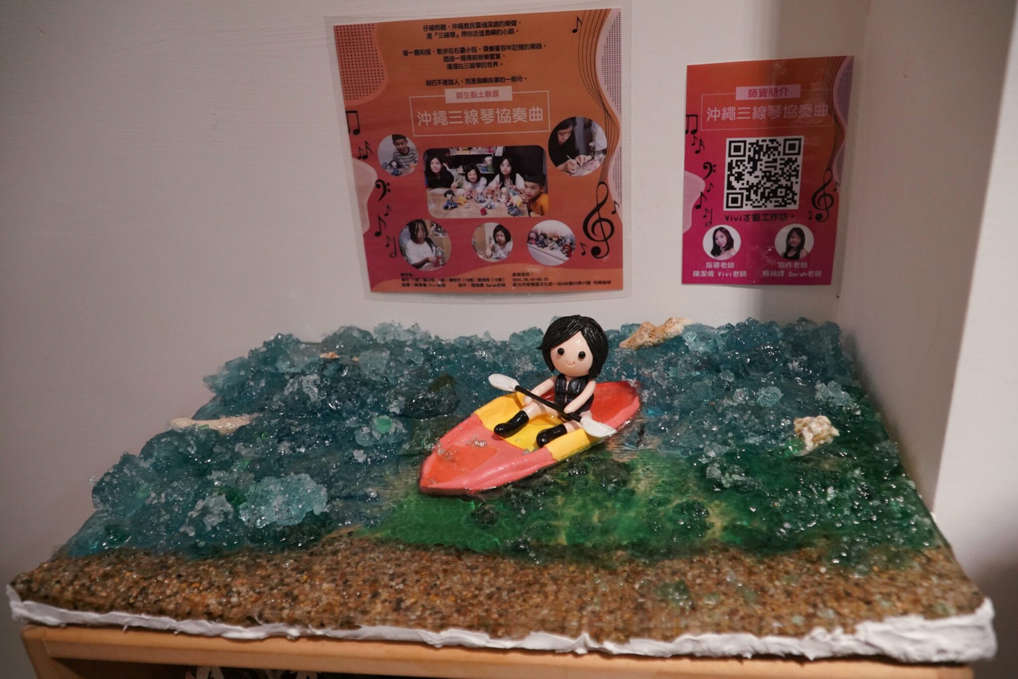 展覽核心聚焦於沖繩傳統樂器——三線琴。Vivi 老師與學生以黏土創作的方式,展現三線琴的造型與演奏意境,並透過文字解說,幫助觀眾認識這項常被誤解為「三味線」的樂器。