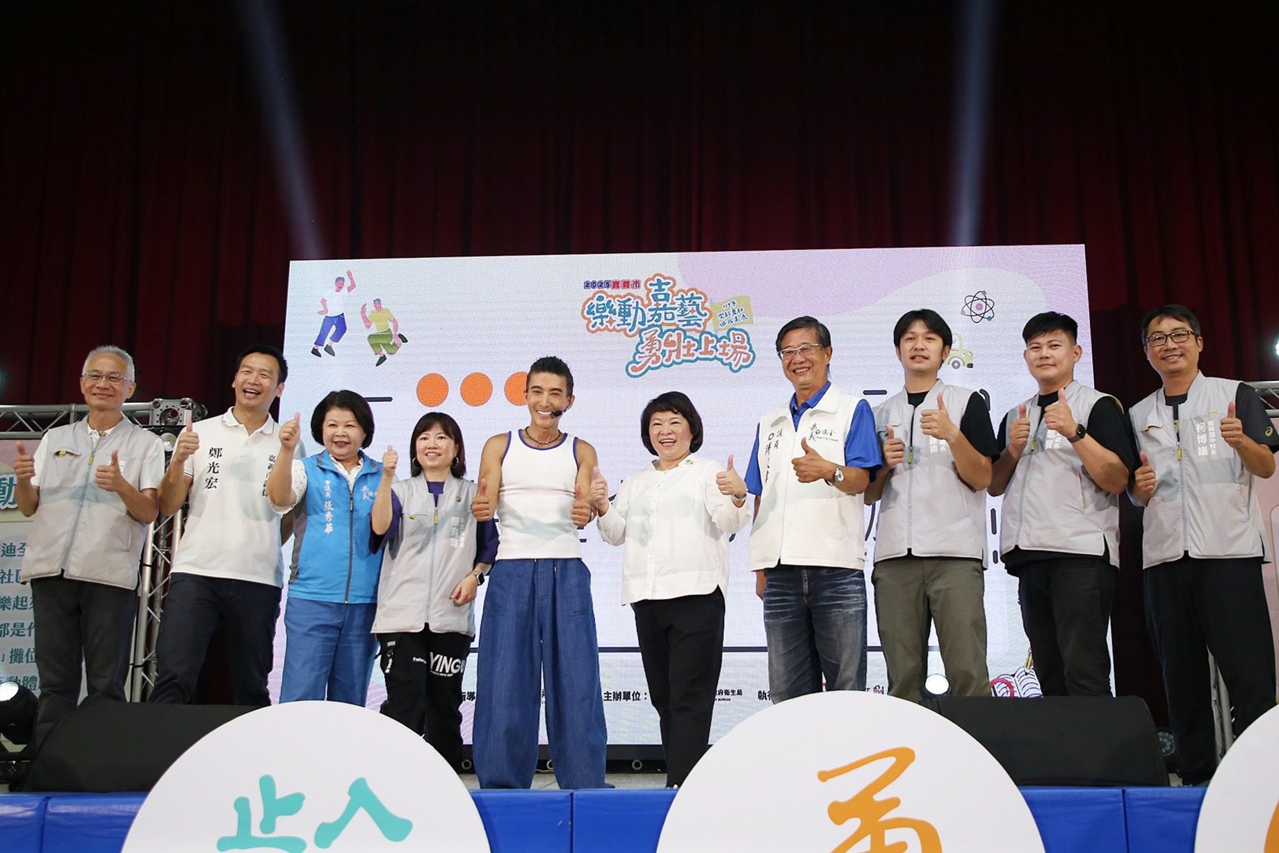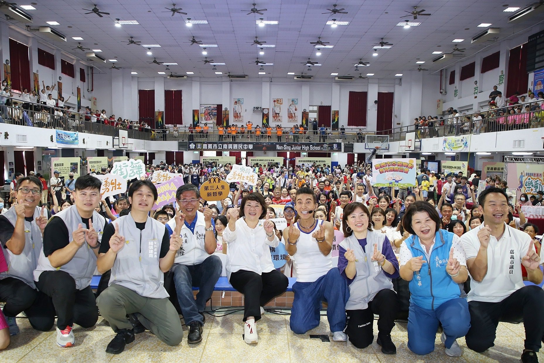 2025年臺灣將邁入超高齡社會,嘉義市開創超高齡社會先機,推動十大旗艦計畫「樂齡勇壯城」,今(14)日於南興國中舉辦「114年樂齡勇壯城成果展」,呈現「建構健康好環境」、「共創銀光價值」、「第三人生新哲學」三大策略,並結合勇壯街舞專屬主題曲-「嘉義City」青銀共舞熱力開場,象徵勇壯族勇於突破、世代共融的精神。嘉義市長黃敏惠與受邀參與活動的「亞洲有氧天王」美譽的潘若迪老師現場帶動跳,與現場近500位市民跟隨音樂齊舞動,展現活力與熱鬧氣氛。