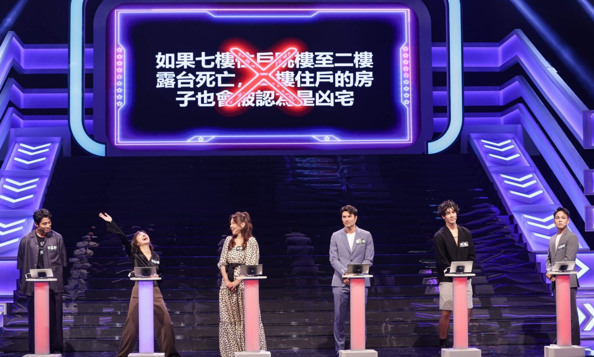 (左起)初孟軒、林葉亭、高雋雅、鳳小岳、納曜、徐詣帆參加公視《哈!真相大白了》錄影、高雋雅一人答對開心地搞笑 照片提供:公視