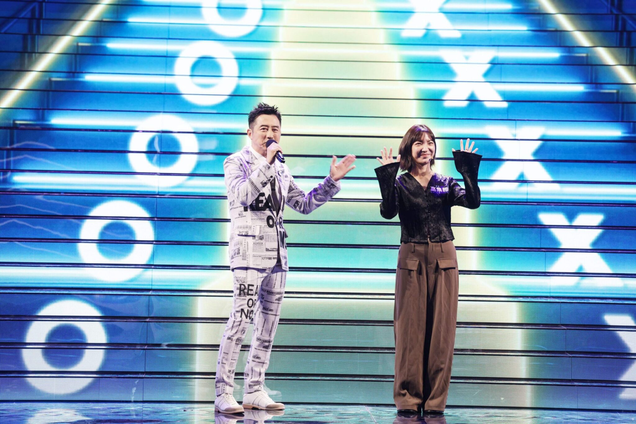 哈林(左)主持公視《哈!真相大白了》 高雋雅(右)在節目上親身驗證「見紅就旺」妙論進入最後一關 照片提供:公視